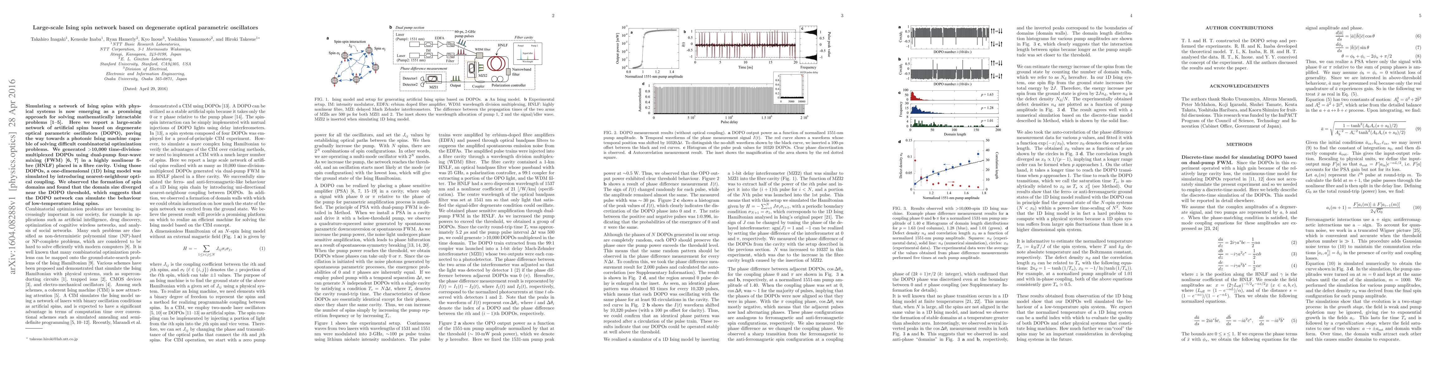 This paper reports the creation of a large-scale Ising spin network using degenerate optical parametric oscillators (DOPOs) to simulate the behavior of low-temperature Ising spins, demonstrating the potential for photonic Ising machines to solve complex optimization problems. The study utilized over 10,000 DOPOs generated via four-wave mixing in a highly nonlinear fiber, observing spin domain formation and divergence near the DOPO threshold.