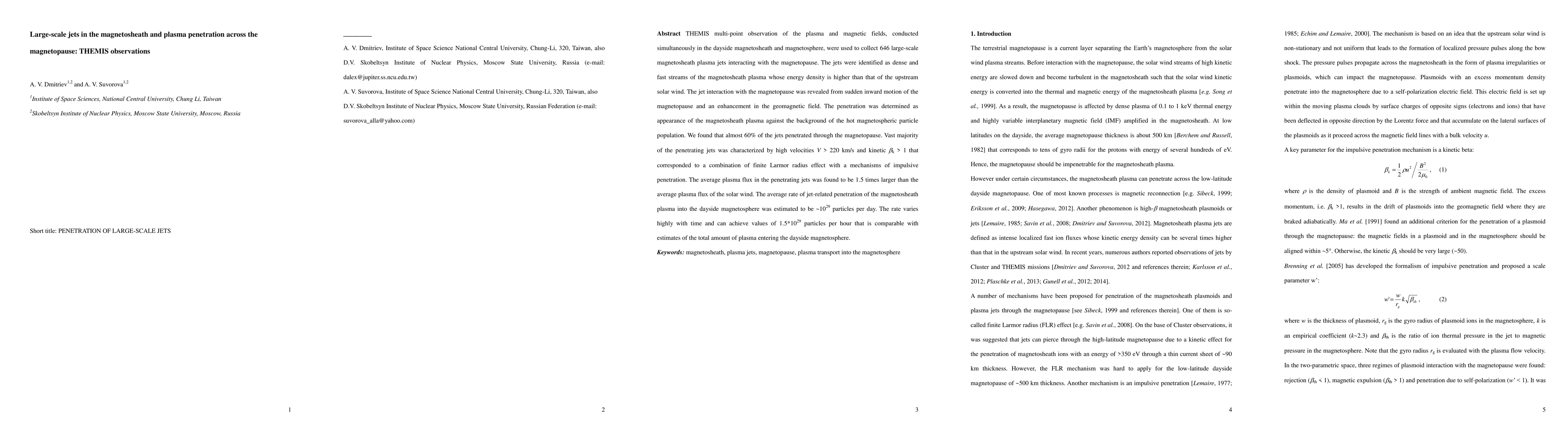 The THEMIS observations identified 646 large-scale magnetosheath plasma jets interacting with the magnetopause, revealing that nearly 60% penetrated through, driven by high velocities and kinetic effects, contributing significantly to magnetospheric plasma influx.