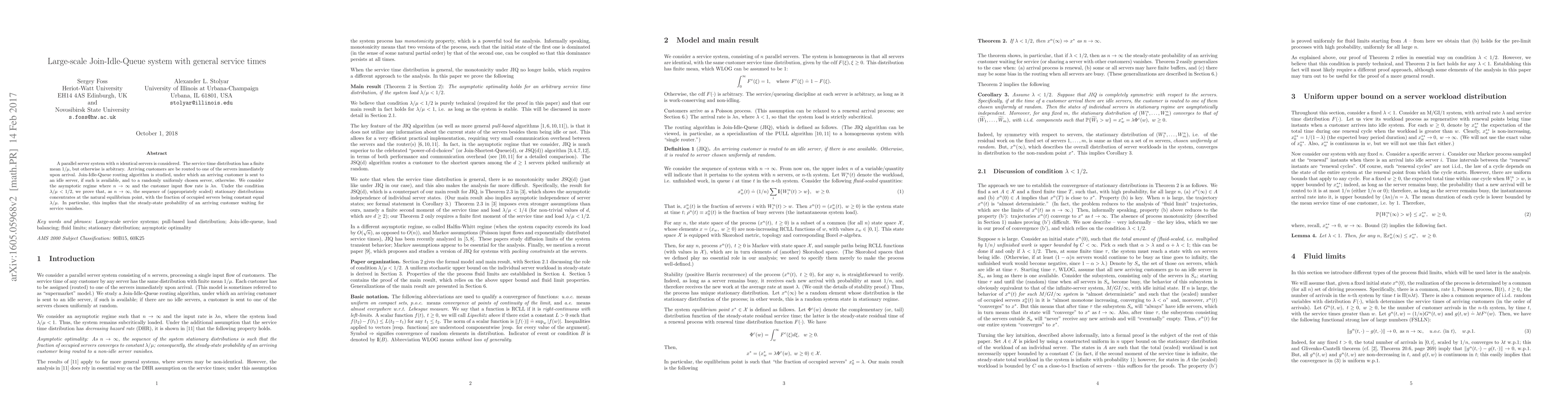 This paper studies a parallel server system with Join-Idle-Queue routing under large-scale limits, where $n$ servers handle customer arrivals with general service times. It proves that under $\lambda/\mu < 1/2$, the system converges to an equilibrium state with a constant fraction of occupied servers equal to $\lambda/\mu$, ensuring no waiting for service in steady state.