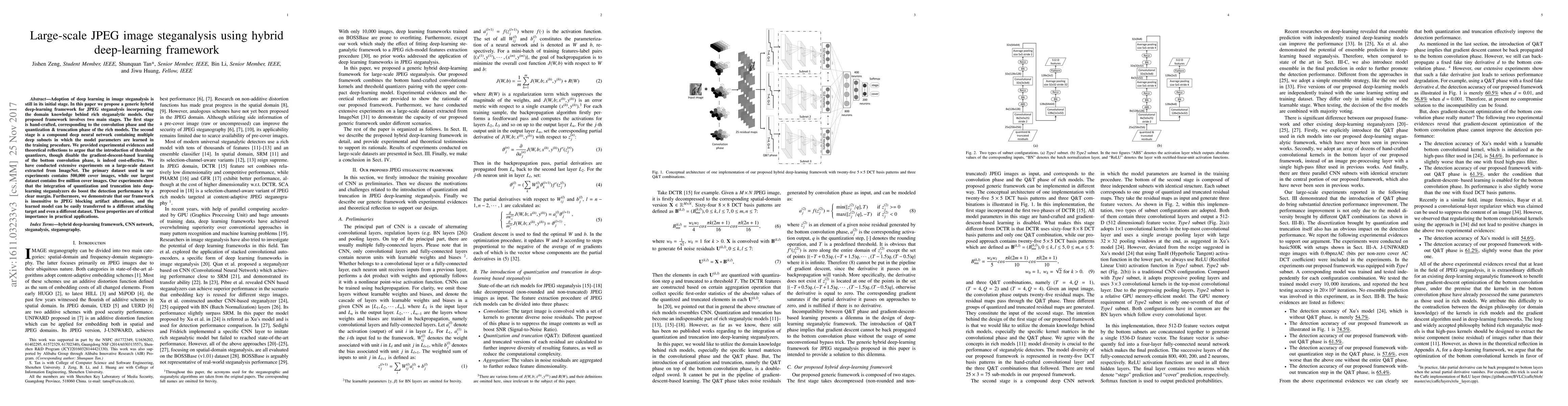 The paper proposes a hybrid deep-learning framework for JPEG steganalysis, integrating hand-crafted and deep-learning stages. It incorporates quantization & truncation (Q&T) phases from rich steganalytic models into a deep neural network, trained on large-scale ImageNet datasets.