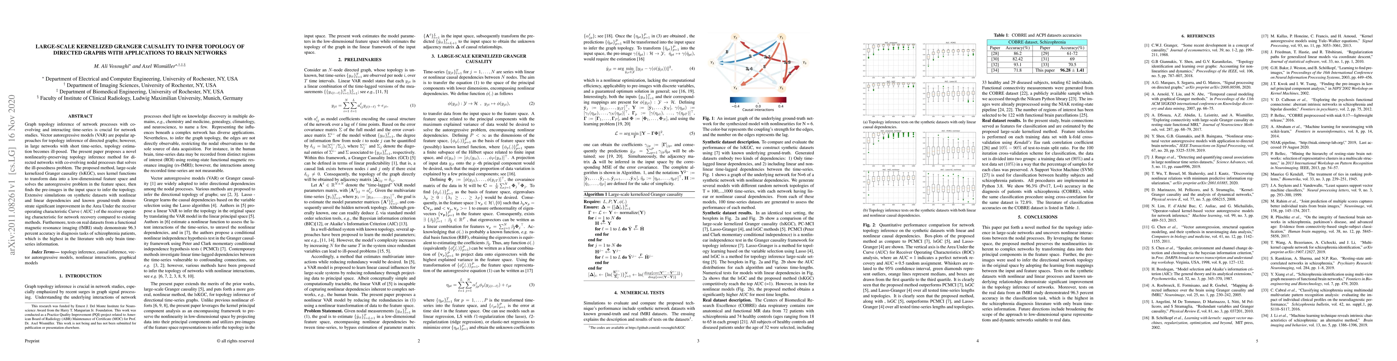Graph topology inference of network processes with co-evolving and interacting time-series is crucial for network studies. Vector autoregressive models (VAR) are popular approaches for topology inference of directed graphs; however, in large networks with short time-series, topology estimation becomes ill-posed. The present paper proposes a novel nonlinearity-preserving topology inference method for directed networks with co-evolving nodal processes that solves the ill-posedness problem. The proposed method, large-scale kernelized Granger causality (lsKGC), uses kernel functions to transform data into a low-dimensional feature space and solves the autoregressive problem in the feature space, then finds the pre-images in the input space to infer the topology. Extensive simulations on synthetic datasets with nonlinear and linear dependencies and known ground-truth demonstrate significant improvement in the Area Under the receiver operating characteristic Curve ( AUC ) of the receiver operating characteristic for network recovery compared to existing methods. Furthermore, tests on real datasets from a functional magnetic resonance imaging (fMRI) study demonstrate 96.3 percent accuracy in diagnosis tasks of schizophrenia patients, which is the highest in the literature with only brain time-series information.