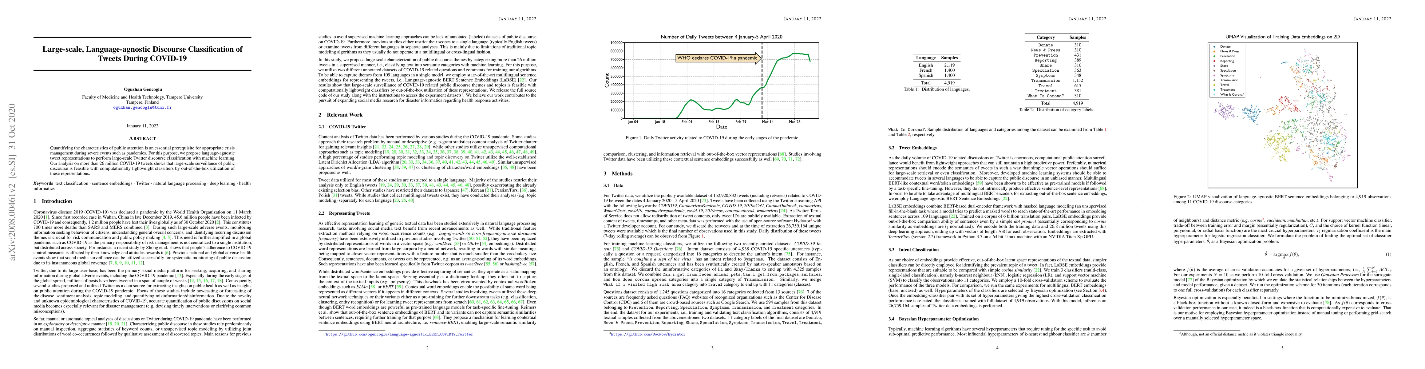 Quantifying the characteristics of public attention is an essential prerequisite for appropriate crisis management during severe events such as pandemics. For this purpose, we propose language-agnostic tweet representations to perform large-scale Twitter discourse classification with machine learning. Our analysis on more than 26 million COVID-19 tweets shows that large-scale surveillance of public discourse is feasible with computationally lightweight classifiers by out-of-the-box utilization of these representations.