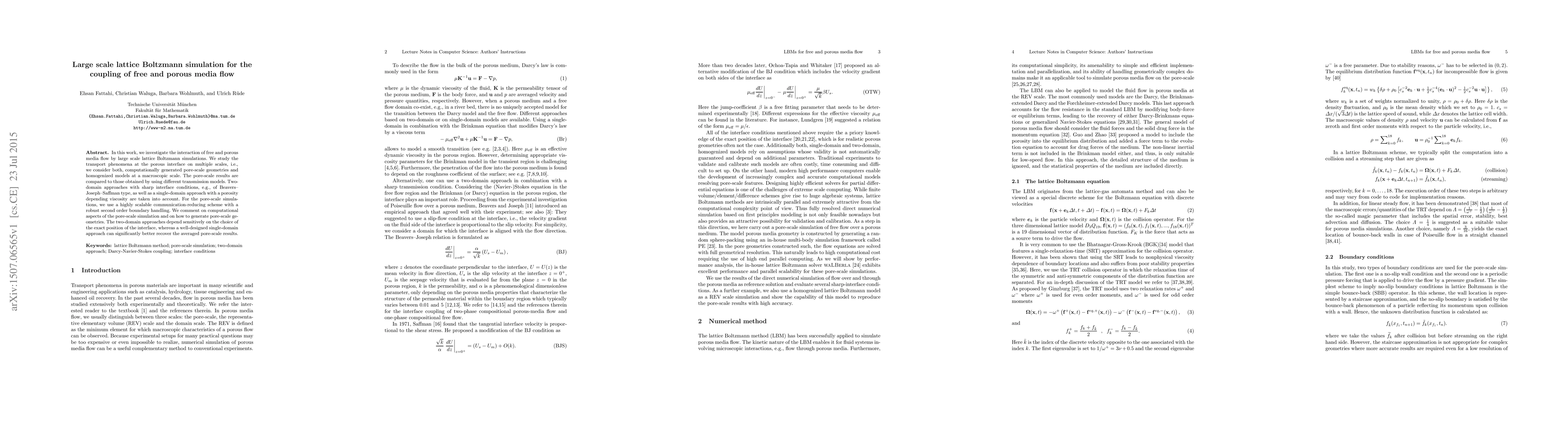 In this work, we investigate the interaction of free and porous media flow by large scale lattice Boltzmann simulations. We study the transport phenomena at the porous interface on multiple scales, i.e., we consider both, computationally generated pore-scale geometries and homogenized models at a macroscopic scale. The pore-scale results are compared to those obtained by using different transmission models. Two-domain approaches with sharp interface conditions, e.g., of Beavers--Joseph--Saffman type, as well as a single-domain approach with a porosity depending viscosity are taken into account. For the pore-scale simulations, we use a highly scalable communication-reducing scheme with a robust second order boundary handling. We comment on computational aspects of the pore-scale simulation and on how to generate pore-scale geometries. The two-domain approaches depend sensitively on the choice of the exact position of the interface, whereas a well-designed single-domain approach can significantly better recover the averaged pore-scale results.