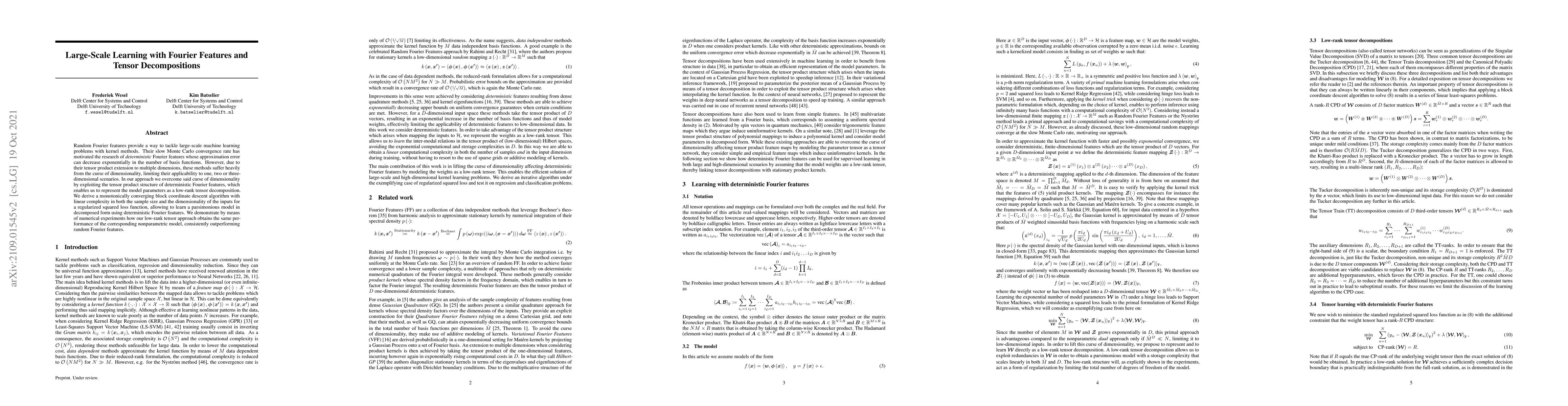 Random Fourier features provide a way to tackle large-scale machine learning problems with kernel methods. Their slow Monte Carlo convergence rate has motivated the research of deterministic Fourier features whose approximation error can decrease exponentially in the number of basis functions. However, due to their tensor product extension to multiple dimensions, these methods suffer heavily from the curse of dimensionality, limiting their applicability to one, two or three-dimensional scenarios. In our approach we overcome said curse of dimensionality by exploiting the tensor product structure of deterministic Fourier features, which enables us to represent the model parameters as a low-rank tensor decomposition. We derive a monotonically converging block coordinate descent algorithm with linear complexity in both the sample size and the dimensionality of the inputs for a regularized squared loss function, allowing to learn a parsimonious model in decomposed form using deterministic Fourier features. We demonstrate by means of numerical experiments how our low-rank tensor approach obtains the same performance of the corresponding nonparametric model, consistently outperforming random Fourier features.