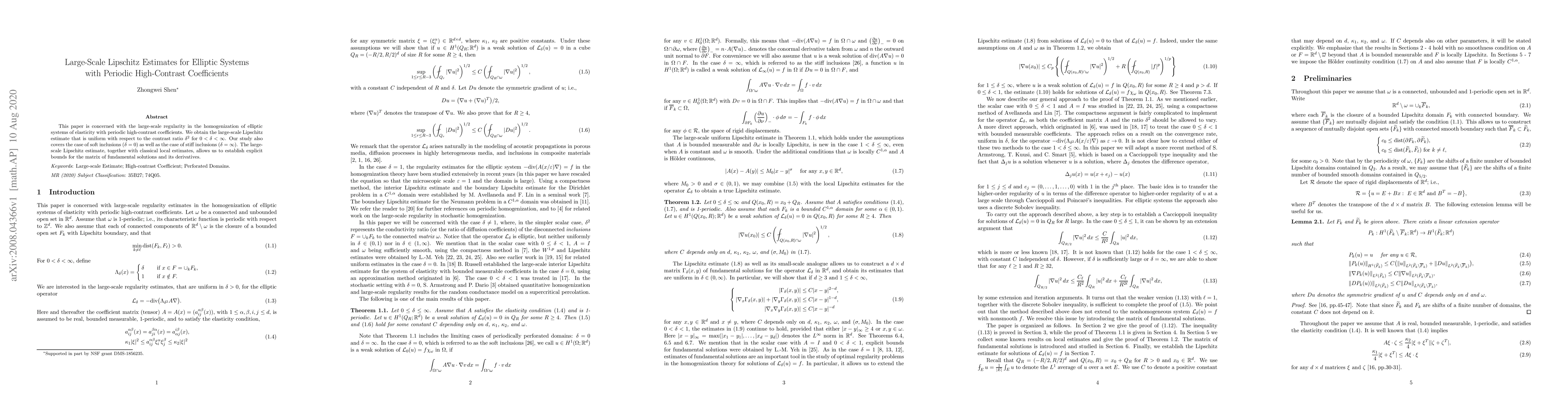 This paper establishes uniform large-scale Lipschitz estimates for homogenized elliptic systems of elasticity with periodic high-contrast coefficients, covering both soft and stiff inclusions. It also provides explicit bounds for the matrix of fundamental solutions and its derivatives.