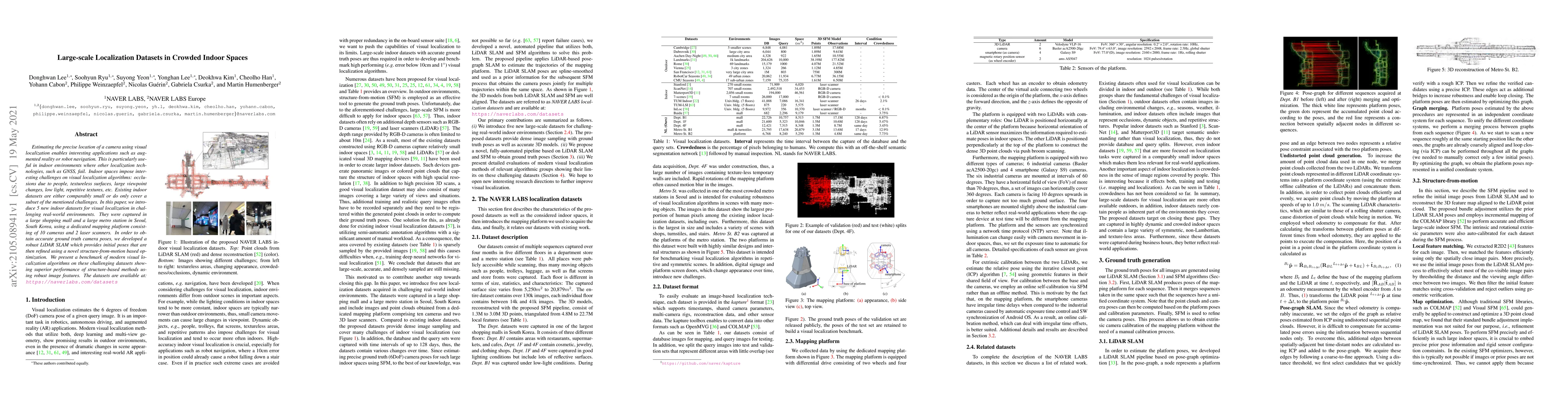Estimating the precise location of a camera using visual localization enables interesting applications such as augmented reality or robot navigation. This is particularly useful in indoor environments where other localization technologies, such as GNSS, fail. Indoor spaces impose interesting challenges on visual localization algorithms: occlusions due to people, textureless surfaces, large viewpoint changes, low light, repetitive textures, etc. Existing indoor datasets are either comparably small or do only cover a subset of the mentioned challenges. In this paper, we introduce 5 new indoor datasets for visual localization in challenging real-world environments. They were captured in a large shopping mall and a large metro station in Seoul, South Korea, using a dedicated mapping platform consisting of 10 cameras and 2 laser scanners. In order to obtain accurate ground truth camera poses, we developed a robust LiDAR SLAM which provides initial poses that are then refined using a novel structure-from-motion based optimization. We present a benchmark of modern visual localization algorithms on these challenging datasets showing superior performance of structure-based methods using robust image features. The datasets are available at: https://naverlabs.com/datasets