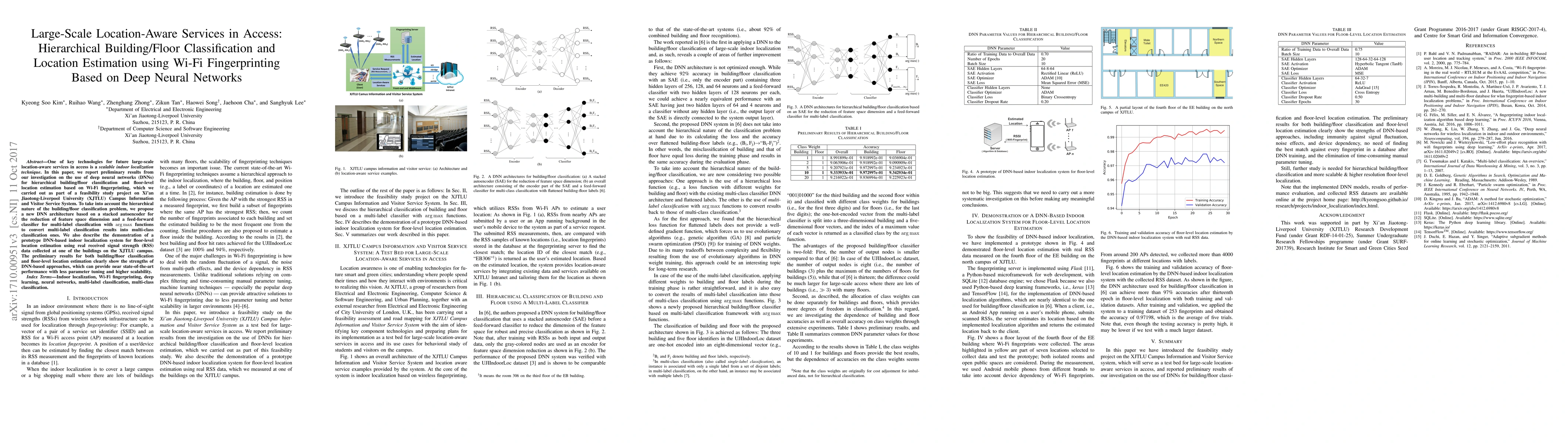 One of key technologies for future large-scale location-aware services in access is a scalable indoor localization technique. In this paper, we report preliminary results from our investigation on the use of deep neural networks (DNNs) for hierarchical building/floor classification and floor-level location estimation based on Wi-Fi fingerprinting, which we carried out as part of a feasibility study project on Xi'an Jiaotong-Liverpool University (XJTLU) Campus Information and Visitor Service System. To take into account the hierarchical nature of the building/floor classification problem, we propose a new DNN architecture based on a stacked autoencoder for the reduction of feature space dimension and a feed-forward classifier for multi-label classification with argmax functions to convert multi-label classification results into multi-class classification ones. We also describe the demonstration of a prototype DNN-based indoor localization system for floor-level location estimation using real received signal strength (RSS) data collected at one of the buildings on the XJTLU campus. The preliminary results for both building/floor classification and floor-level location estimation clearly show the strengths of DNN-based approaches, which can provide near state-of-the-art performance with less parameter tuning and higher scalability.