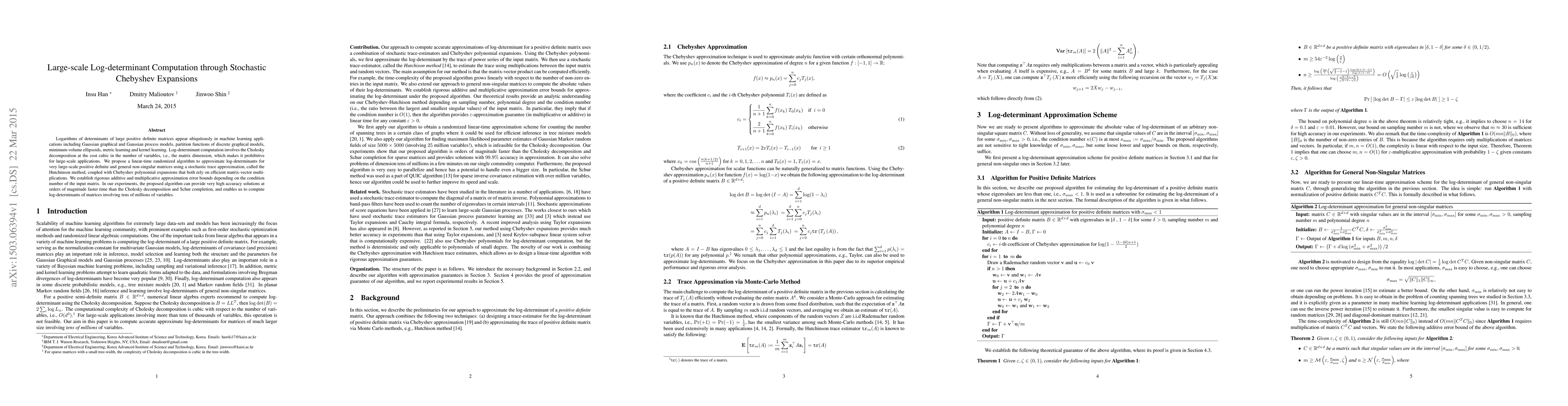Logarithms of determinants of large positive definite matrices appear ubiquitously in machine learning applications including Gaussian graphical and Gaussian process models, partition functions of discrete graphical models, minimum-volume ellipsoids, metric learning and kernel learning. Log-determinant computation involves the Cholesky decomposition at the cost cubic in the number of variables, i.e., the matrix dimension, which makes it prohibitive for large-scale applications. We propose a linear-time randomized algorithm to approximate log-determinants for very large-scale positive definite and general non-singular matrices using a stochastic trace approximation, called the Hutchinson method, coupled with Chebyshev polynomial expansions that both rely on efficient matrix-vector multiplications. We establish rigorous additive and multiplicative approximation error bounds depending on the condition number of the input matrix. In our experiments, the proposed algorithm can provide very high accuracy solutions at orders of magnitude faster time than the Cholesky decomposition and Schur completion, and enables us to compute log-determinants of matrices involving tens of millions of variables.