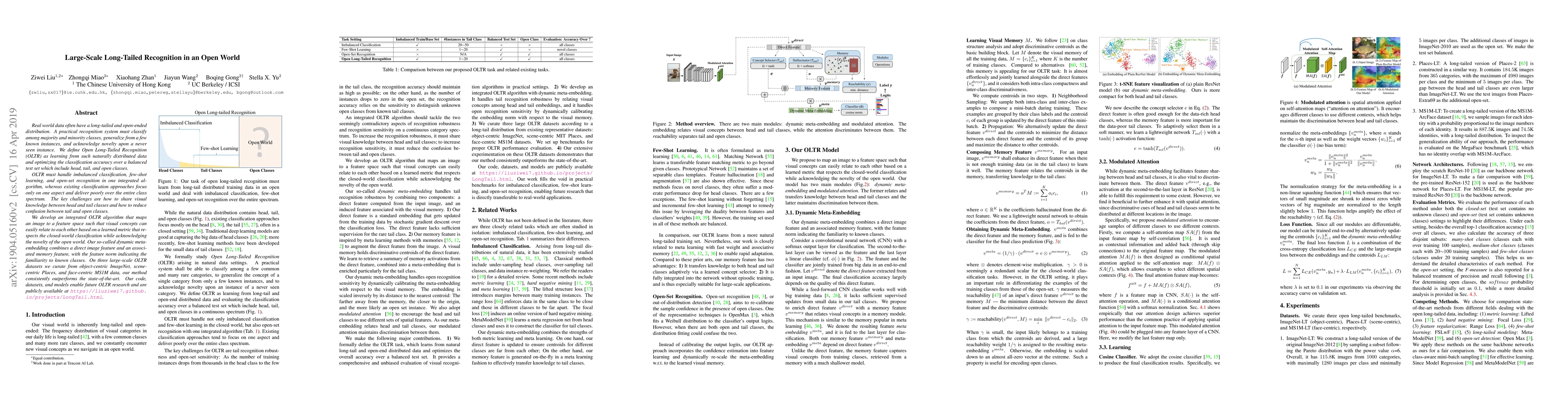 This paper proposes an Open Long-Tailed Recognition (OLTR) algorithm to address the challenges of classifying long-tailed and open-world data, integrating imbalanced classification, few-shot learning, and open-set recognition. The dynamic meta-embedding method outperforms existing approaches on large-scale datasets from ImageNet, Places, and MS1M.