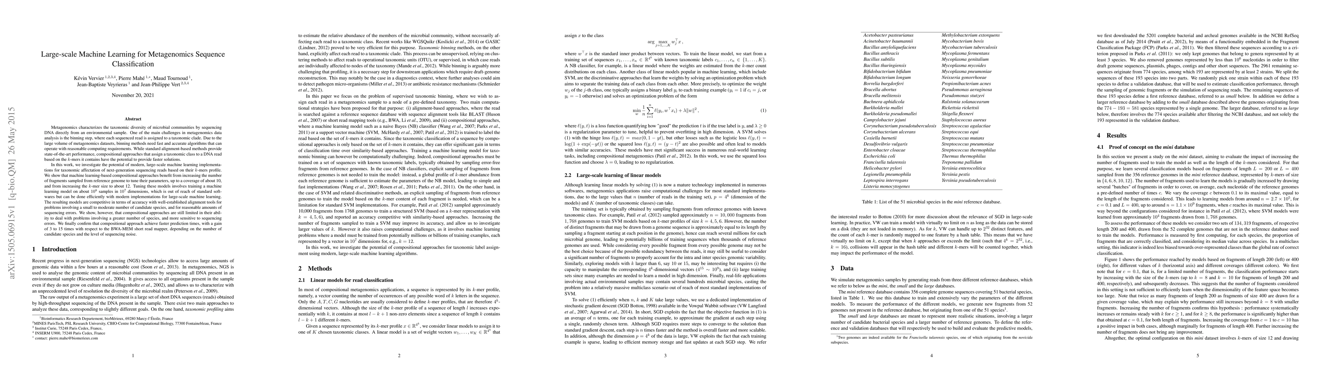 This paper explores the use of large-scale machine learning for classifying metagenomics sequences based on k-mer profiles, demonstrating competitive accuracy with alignment-based methods while achieving significantly faster prediction times. The study finds that optimal performance requires tuning with a large number of reference genome fragments and larger k-mer sizes.