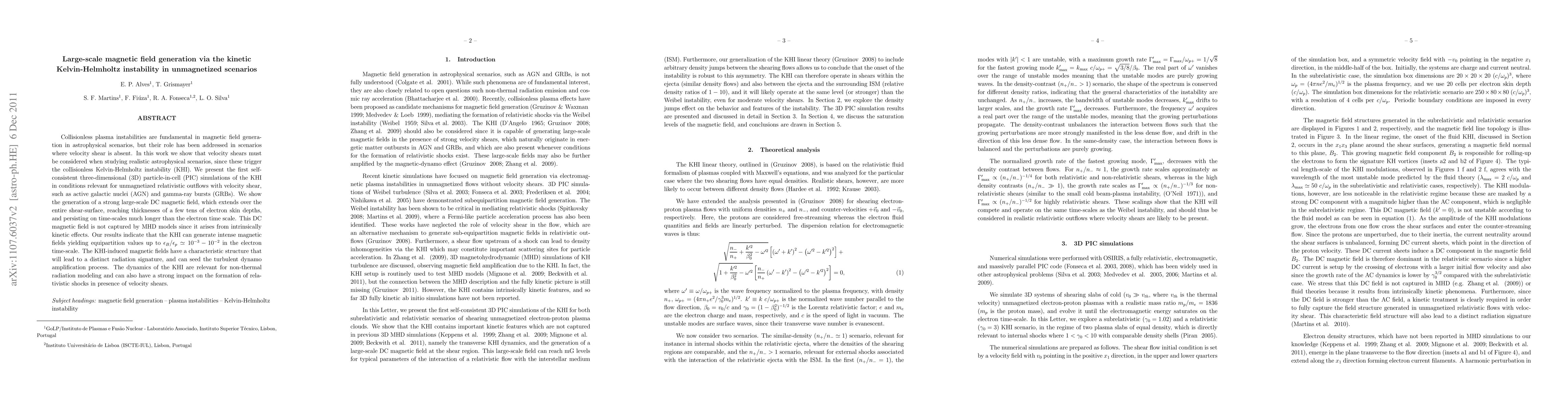 This paper demonstrates that the kinetic Kelvin-Helmholtz instability (KHI) in unmagnetized relativistic outflows, driven by velocity shears, can generate large-scale DC magnetic fields. The study uses 3D PIC simulations to show that these fields arise from kinetic effects not captured by MHD models, impacting non-thermal radiation and shock formation in astrophysical scenarios like AGN and GRBs.