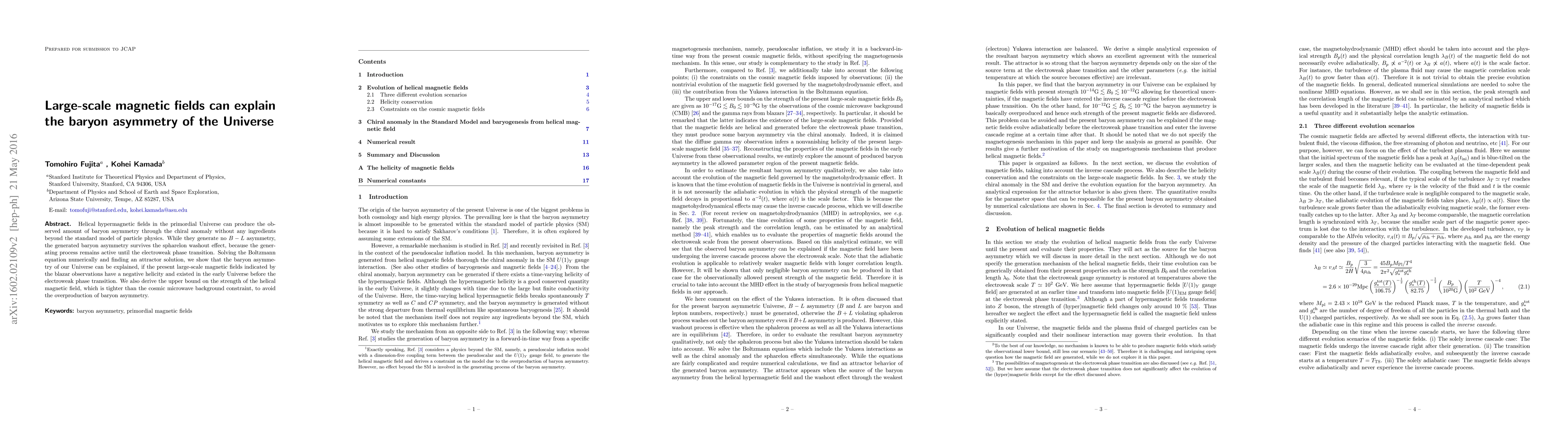 This paper proposes that helical hypermagnetic fields in the early Universe can explain the observed baryon asymmetry through the chiral anomaly, without requiring extensions to the standard model. It finds that the present large-scale magnetic fields, indicated by blazar observations, must have had negative helicity to generate the correct baryon asymmetry before the electroweak phase transition.