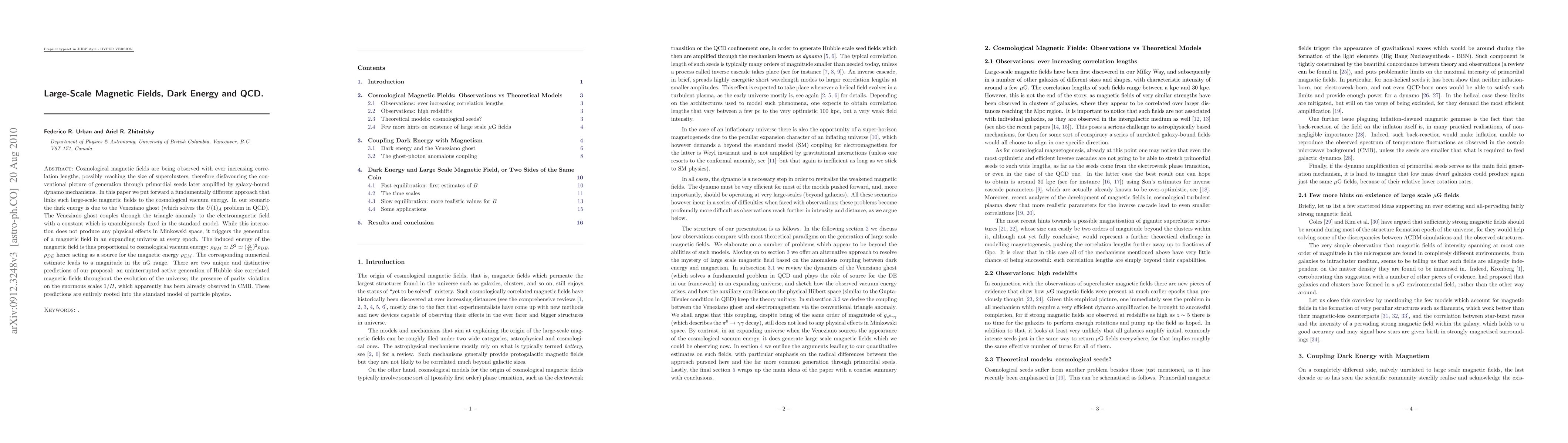 Cosmological magnetic fields are being observed with ever increasing correlation lengths, possibly reaching the size of superclusters, therefore disfavouring the conventional picture of generation through primordial seeds later amplified by galaxy-bound dynamo mechanisms. In this paper we put forward a fundamentally different approach that links such large-scale magnetic fields to the cosmological vacuum energy. In our scenario the dark energy is due to the Veneziano ghost (which solves the $U(1)_A$ problem in QCD). The Veneziano ghost couples through the triangle anomaly to the electromagnetic field with a constant which is unambiguously fixed in the standard model. While this interaction does not produce any physical effects in Minkowski space, it triggers the generation of a magnetic field in an expanding universe at every epoch. The induced energy of the magnetic field is thus proportional to cosmological vacuum energy: $\rho_{EM}\simeq B^2 \simeq (\frac{\alpha}{4\pi})^2 \rho_{DE}$, $\rho_{DE}$ hence acting as a source for the magnetic energy $\rho_{EM}$. The corresponding numerical estimate leads to a magnitude in the nG range. There are two unique and distinctive predictions of our proposal: an uninterrupted active generation of Hubble size correlated magnetic fields throughout the evolution of the universe; the presence of parity violation on the enormous scales $1/H$, which apparently has been already observed in CMB. These predictions are entirely rooted into the standard model of particle physics.