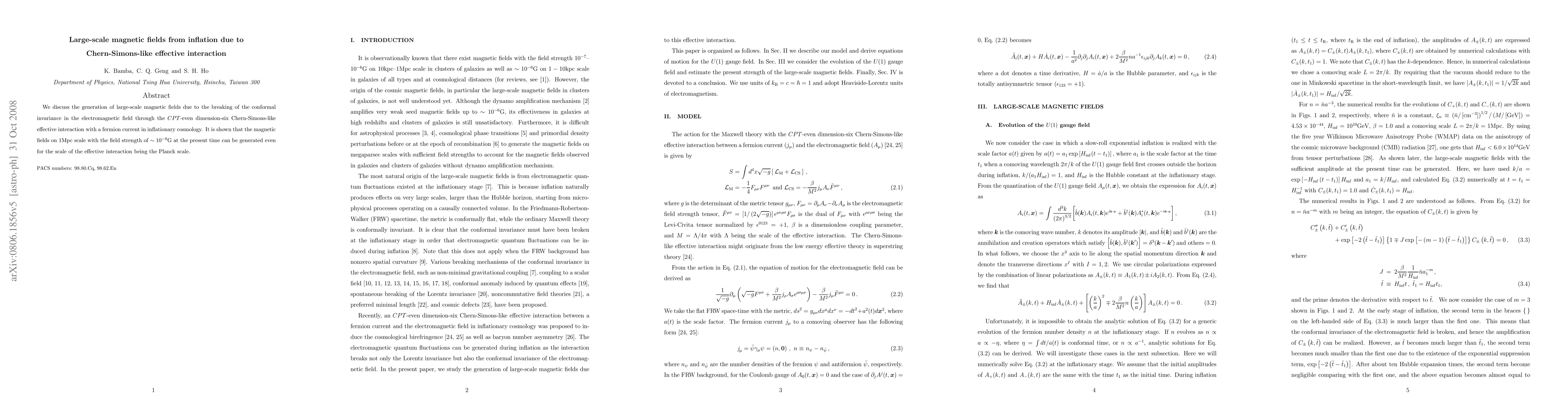 We discuss the generation of large-scale magnetic fields due to the breaking of the conformal invariance in the electromagnetic field through the $CPT$-even dimension-six Chern-Simons-like effective interaction with a fermion current in inflationary cosmology. It is shown that the magnetic fields on 1Mpc scale with the field strength of $\sim 10^{-9}$G at the present time can be generated even for the scale of the effective interaction being the Planck scale.