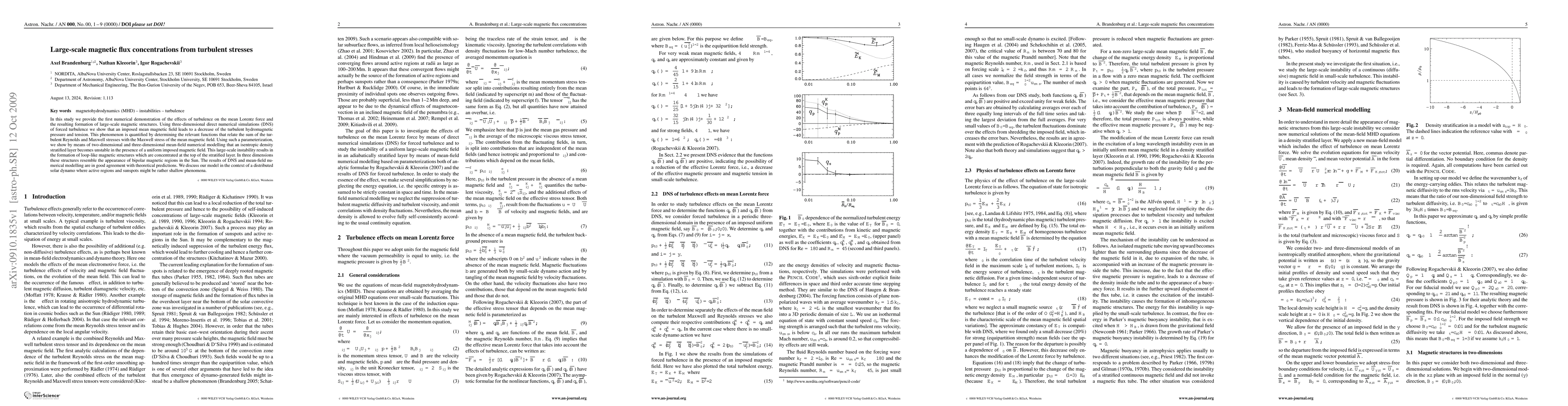 In this study we provide the first numerical demonstration of the effects of turbulence on the mean Lorentz force and the resulting formation of large-scale magnetic structures. Using three-dimensional direct numerical simulations (DNS) of forced turbulence we show that an imposed mean magnetic field leads to a decrease of the turbulent hydromagnetic pressure and tension. This phenomenon is quantified by determining the relevant functions that relate the sum of the turbulent Reynolds and Maxwell stresses with the Maxwell stress of the mean magnetic field. Using such a parameterization, we show by means of two-dimensional and three-dimensional mean-field numerical modelling that an isentropic density stratified layer becomes unstable in the presence of a uniform imposed magnetic field. This large-scale instability results in the formation of loop-like magnetic structures which are concentrated at the top of the stratified layer. In three dimensions these structures resemble the appearance of bipolar magnetic regions in the Sun. The results of DNS and mean-field numerical modelling are in good agreement with theoretical predictions. We discuss our model in the context of a distributed solar dynamo where active regions and sunspots might be rather shallow phenomena.