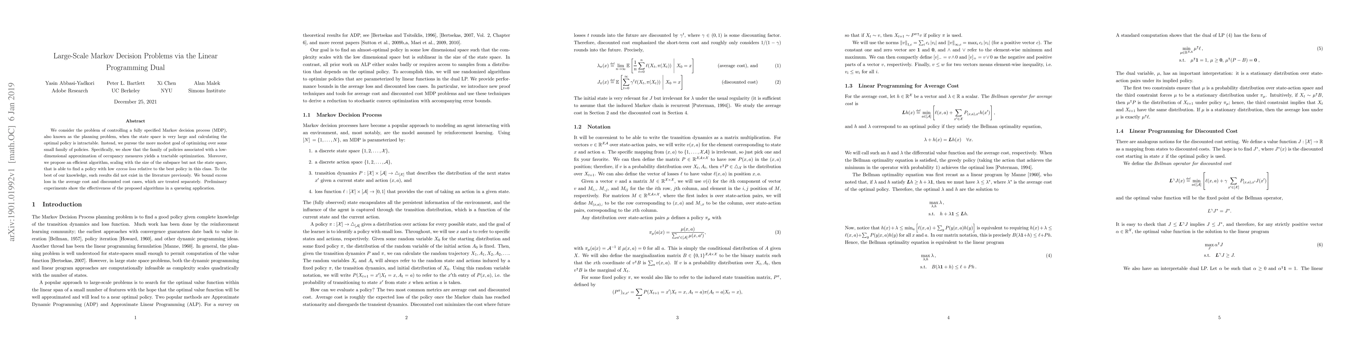 This research paper proposes an algorithm to optimize policies for large-scale Markov decision problems by approximating a small family of policies, reducing computational complexity while maintaining low excess loss relative to the best policy.