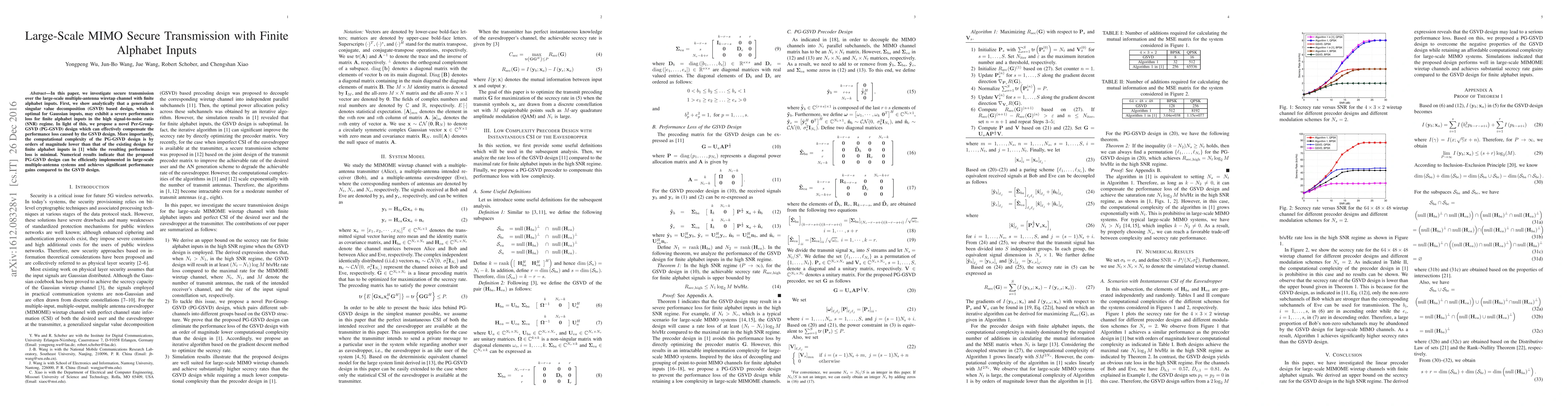In this paper, we investigate secure transmission over the large-scale multiple-antenna wiretap channel with finite alphabet inputs. First, we show analytically that a generalized singular value decomposition (GSVD) based design, which is optimal for Gaussian inputs, may exhibit a severe performance loss for finite alphabet inputs in the high signal-to-noise ratio (SNR) regime. In light of this, we propose a novel Per-Group-GSVD (PG-GSVD) design which can effectively compensate the performance loss caused by the GSVD design. More importantly, the computational complexity of the PG-GSVD design is by orders of magnitude lower than that of the existing design for finite alphabet inputs in [1] while the resulting performance loss is minimal. Numerical results indicate that the proposed PG-GSVD design can be efficiently implemented in large-scale multiple-antenna systems and achieves significant performance gains compared to the GSVD design.