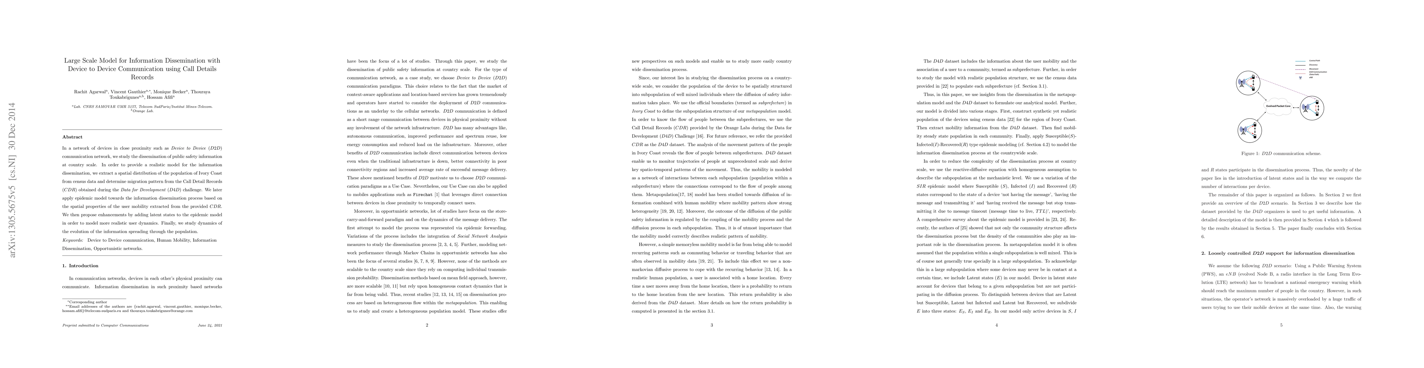 This paper develops a large-scale model for disseminating public safety information in Device to Device communication networks using Ivory Coast census and Call Detail Records data. It employs an epidemic model enhanced with latent states to realistically simulate user mobility and information spread dynamics.