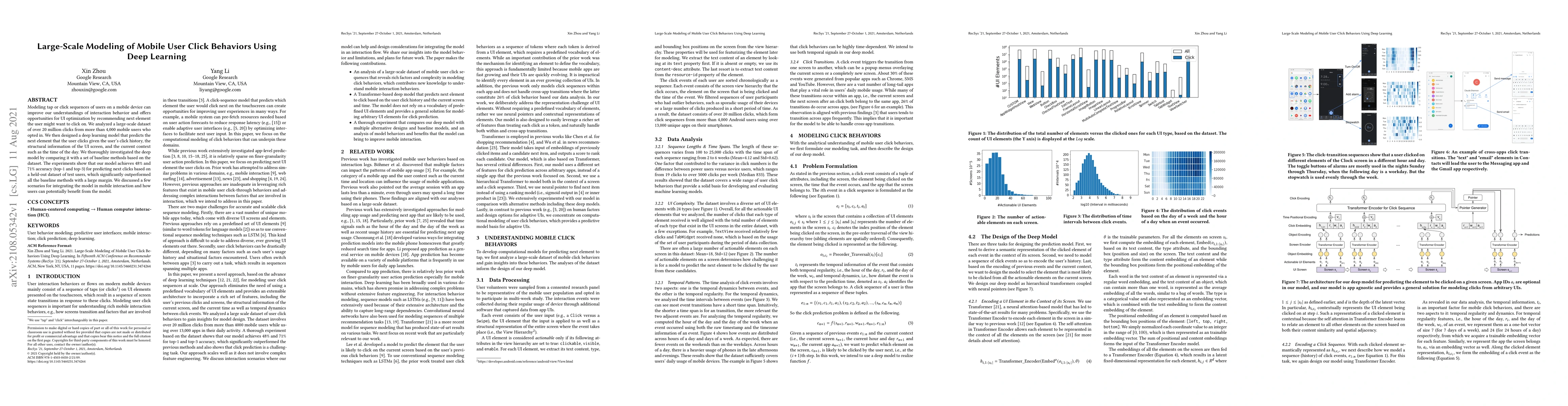 This paper presents a deep learning model to predict mobile user click behaviors based on click history, UI structure, and context. The model significantly outperforms baselines, achieving 48% top-1 and 71% top-3 accuracy, and offers potential for UI optimization and user interaction improvements.