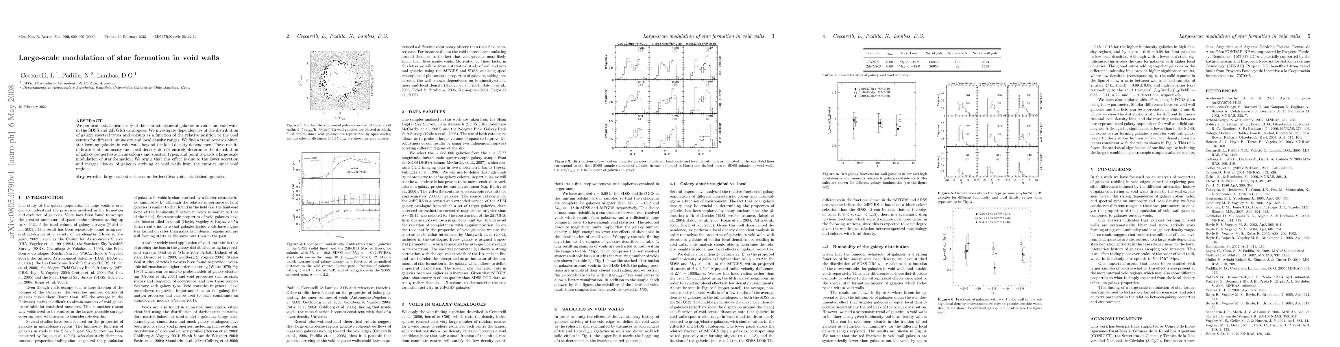 We perform a statistical study of the characteristics of galaxies in voids and void walls in the SDSS and 2dFGRS catalogues. We investigate dependencies of the distribution of galaxy spectral types and colours as a function of the relative position to the void centres for different luminosity and local density ranges. We find a trend towards bluer, star forming galaxies in void walls beyond the local density dependence. These results indicate that luminosity and local density do not entirely determine the distribution of galaxy properties such as colours and spectral types, and point towards a large scale modulation of star formation. We argue that this effect is due to the lower accretion and merger history of galaxies arriving at void walls from the emptier inner void regions.