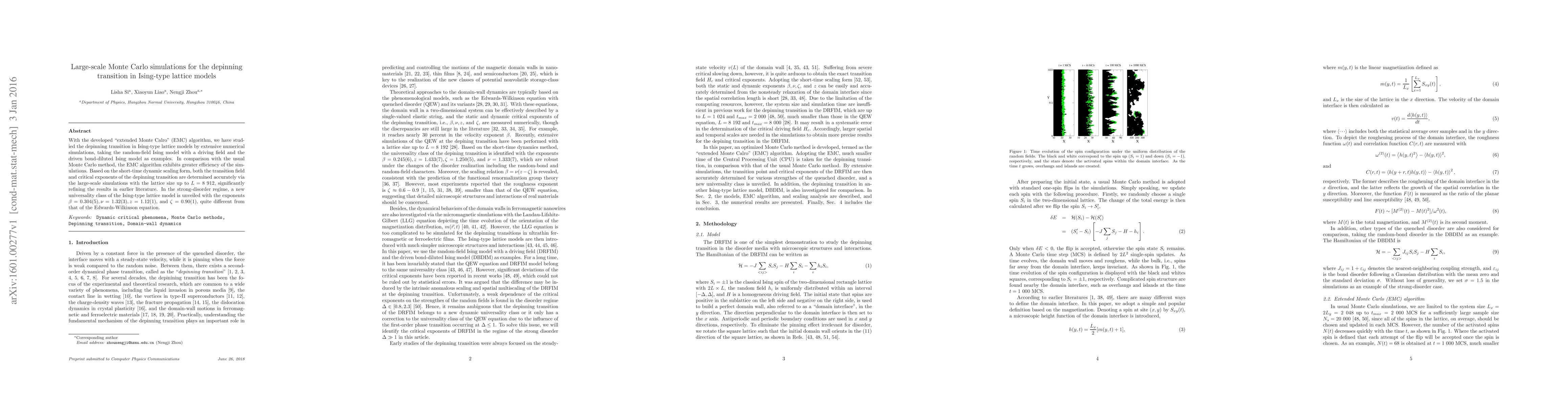 With the developed "extended Monte Calro" (EMC) algorithm, we have studied the depinning transition in Ising-type lattice models by extensive numerical simulations, taking the random-field Ising model with a driving field and the driven bond-diluted Ising model as examples. In comparison with the usual Monte Carlo method, the EMC algorithm exhibits greater efficiency of the simulations. Based on the short-time dynamic scaling form, both the transition field and critical exponents of the depinning transition are determined accurately via the large-scale simulations with the lattice size up to L = 8 912, significantly refining the results in earlier literature. In the strong-disorder regime, a new universality class of the Ising-type lattice model is unveiled with the exponents {\beta} = 0.304(5), {\nu} = 1.32(3), z = 1.12(1), and {\zeta} = 0.90(1), quite different from that of the quenched Edwards-Wilkinson equation.
