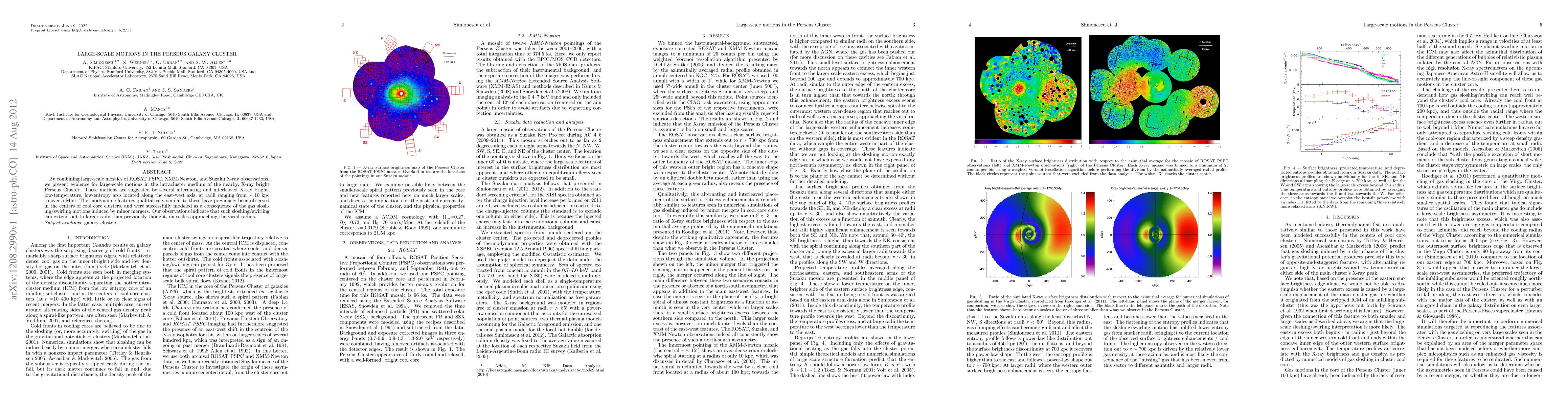This paper presents evidence of large-scale motions in the Perseus Galaxy Cluster's intracluster medium, detected through combined X-ray observations, showing alternating X-ray arcs indicative of gas sloshing/swirling likely caused by minor mergers. These motions extend to larger radii than previously observed, reaching nearly the cluster's virial radius.