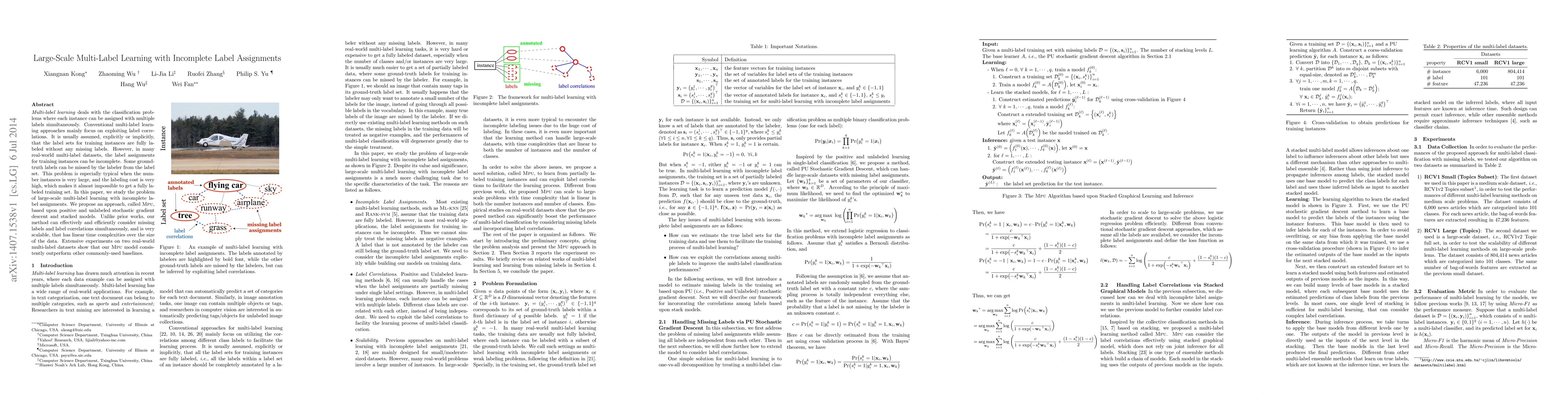 Multi-label learning deals with the classification problems where each instance can be assigned with multiple labels simultaneously. Conventional multi-label learning approaches mainly focus on exploiting label correlations. It is usually assumed, explicitly or implicitly, that the label sets for training instances are fully labeled without any missing labels. However, in many real-world multi-label datasets, the label assignments for training instances can be incomplete. Some ground-truth labels can be missed by the labeler from the label set. This problem is especially typical when the number instances is very large, and the labeling cost is very high, which makes it almost impossible to get a fully labeled training set. In this paper, we study the problem of large-scale multi-label learning with incomplete label assignments. We propose an approach, called MPU, based upon positive and unlabeled stochastic gradient descent and stacked models. Unlike prior works, our method can effectively and efficiently consider missing labels and label correlations simultaneously, and is very scalable, that has linear time complexities over the size of the data. Extensive experiments on two real-world multi-label datasets show that our MPU model consistently outperform other commonly-used baselines.