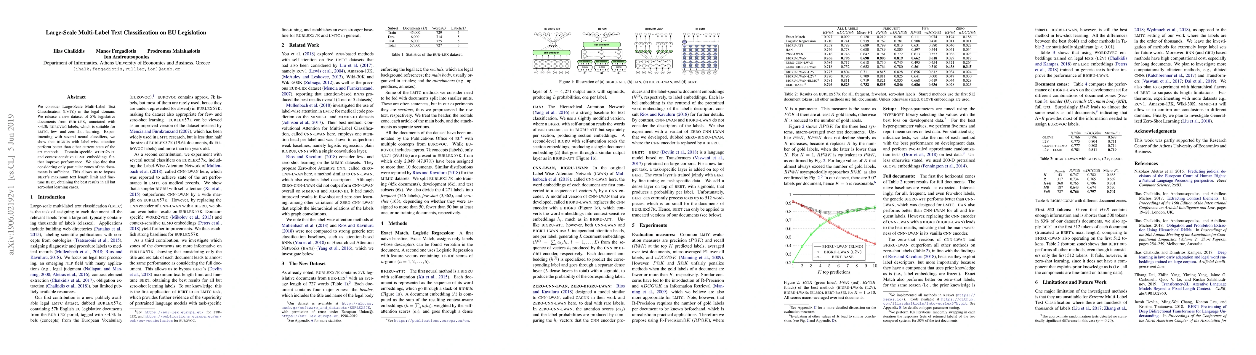 This study introduces a new dataset of 57k EU legislative documents with 4.3k EUROVOC labels for large-scale multi-label text classification. BIGRUs with label-wise attention and domain-specific embeddings outperform existing methods, and focusing on specific document zones allows for BERT fine-tuning, achieving top results except in zero-shot learning scenarios.