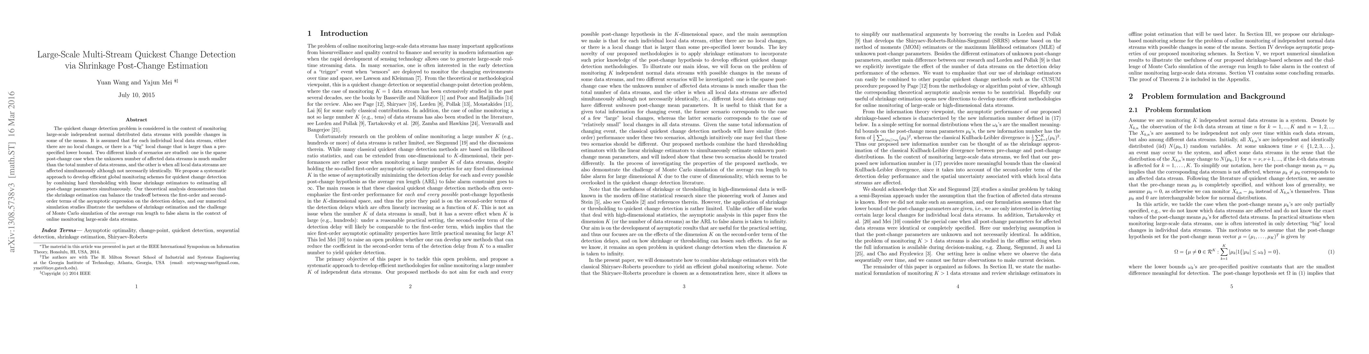 The paper proposes a systematic approach for quickest change detection in large-scale independent normal distributed data streams with potential mean changes, employing shrinkage estimation to balance detection delays and optimize post-change parameter estimation. The method effectively handles both sparse and fully affected scenarios, demonstrating theoretical and empirical effectiveness.