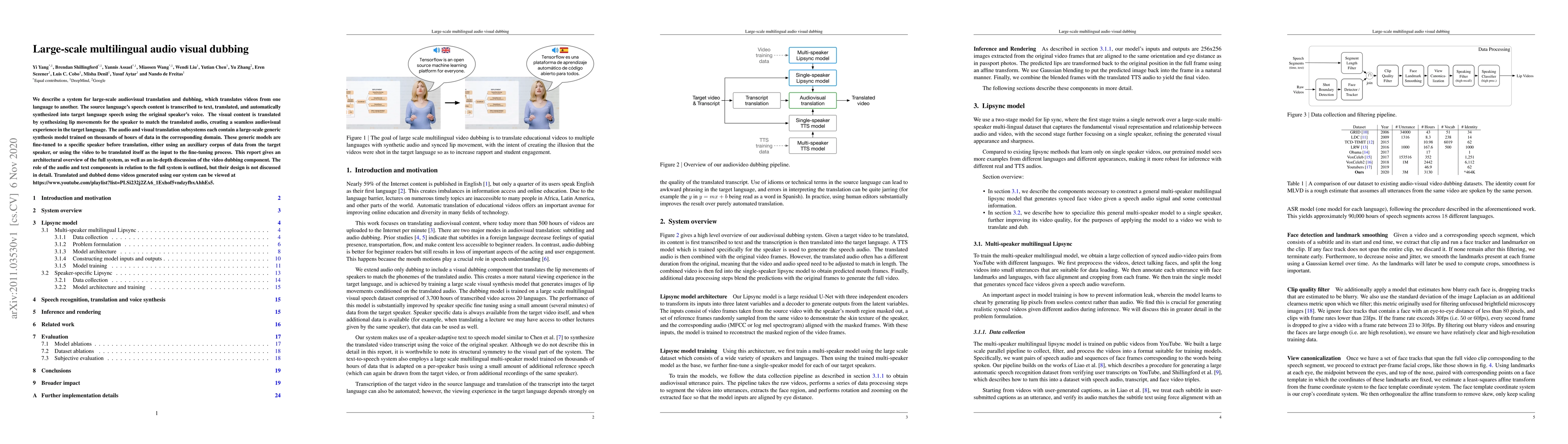 Researchers developed a system for large-scale audiovisual dubbing, translating videos from one language to another using machine learning models and fine-tuning them on specific speakers or data.