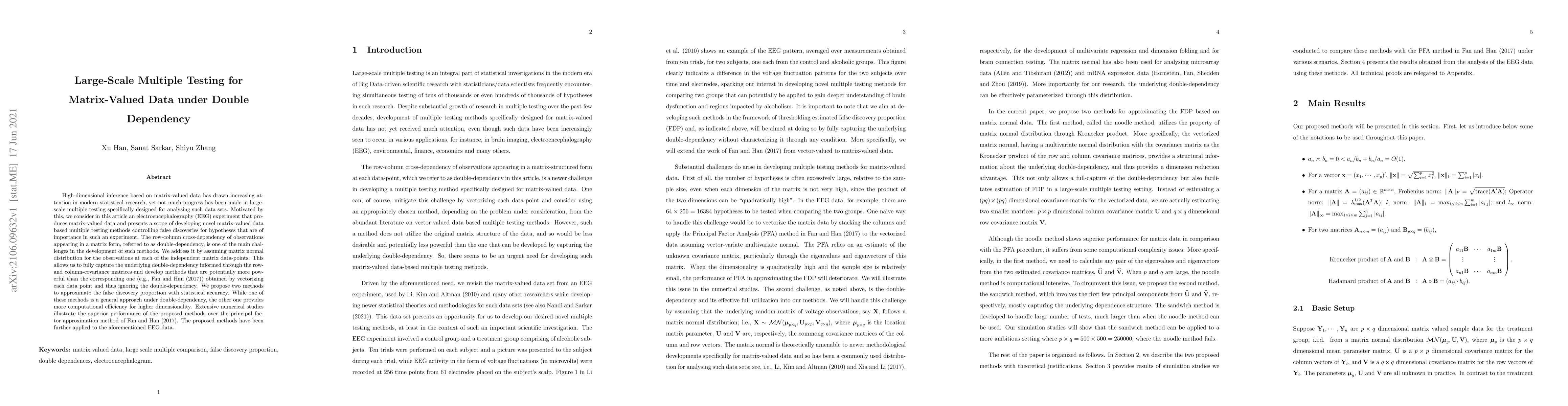 This paper develops novel multiple testing methods for large-scale matrix-valued data, specifically addressing the challenge of double-dependency in EEG experiments. The proposed methods, which assume matrix normal distribution, outperform existing vectorization-based approaches by capturing row-column cross-dependencies more accurately, demonstrating superior performance through extensive numerical studies and application to EEG data.