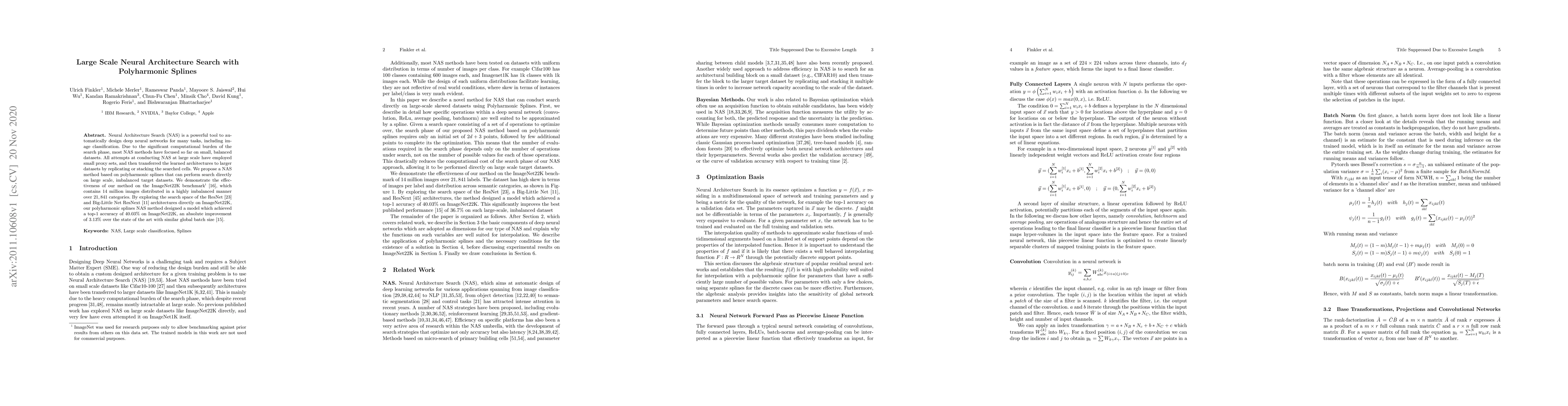 This paper proposes a Neural Architecture Search (NAS) method based on polyharmonic splines for large-scale, imbalanced datasets, achieving a top-1 accuracy of 40.03% on ImageNet22K, outperforming the state of the art by 3.13%. The method directly searches the architecture space on the full dataset, avoiding the need for proxy sets.