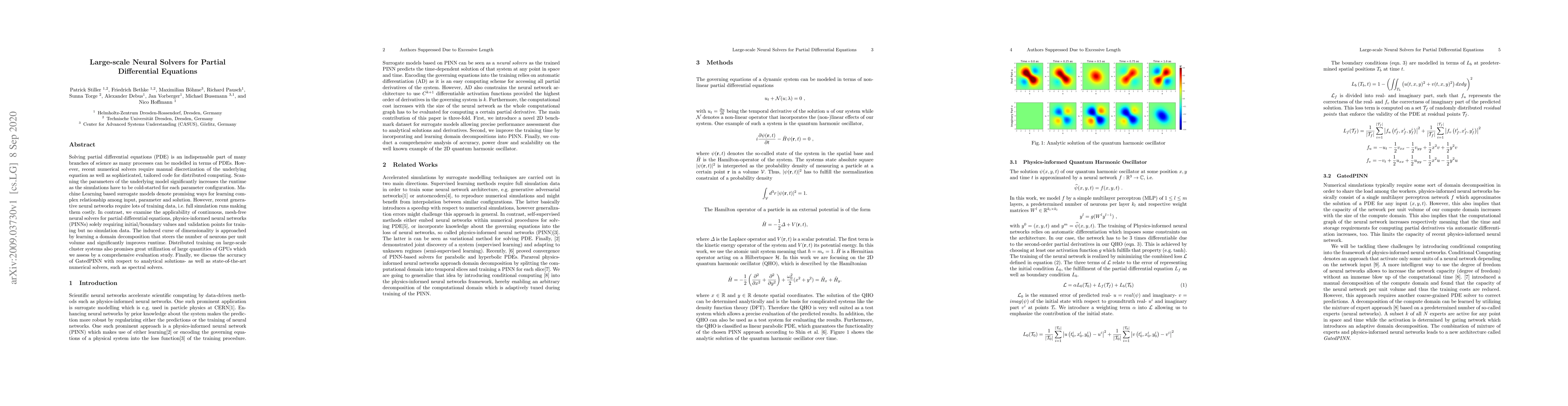 Solving partial differential equations (PDE) is an indispensable part of many branches of science as many processes can be modelled in terms of PDEs. However, recent numerical solvers require manual discretization of the underlying equation as well as sophisticated, tailored code for distributed computing. Scanning the parameters of the underlying model significantly increases the runtime as the simulations have to be cold-started for each parameter configuration. Machine Learning based surrogate models denote promising ways for learning complex relationship among input, parameter and solution. However, recent generative neural networks require lots of training data, i.e. full simulation runs making them costly. In contrast, we examine the applicability of continuous, mesh-free neural solvers for partial differential equations, physics-informed neural networks (PINNs) solely requiring initial/boundary values and validation points for training but no simulation data. The induced curse of dimensionality is approached by learning a domain decomposition that steers the number of neurons per unit volume and significantly improves runtime. Distributed training on large-scale cluster systems also promises great utilization of large quantities of GPUs which we assess by a comprehensive evaluation study. Finally, we discuss the accuracy of GatedPINN with respect to analytical solutions -- as well as state-of-the-art numerical solvers, such as spectral solvers.