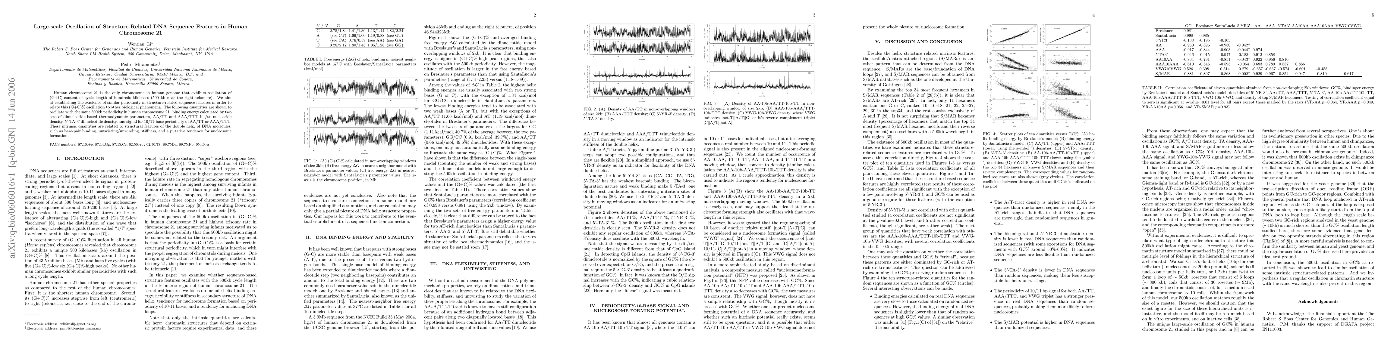 Human chromosome 21 is the only chromosome in human genome that exhibits oscillation of (G+C)-content of cycle length of hundreds kilobases (500 kb near the right telomere). We aim at establishing the existence of similar periodicity in structure-related sequence features in order to relate this (G+C)% oscillation to other biological phenomena. The following quantities are shown to oscillate with the same 500kb periodicity in human chromosome 21: binding energy calculated by two sets of dinucleotide-based thermodynamic parameters, AA/TT and AAA/TTT bi-/tri-nucleotide density, 5'-TA-3' dinucleotide density, and signal for 10/11-base periodicity of AA/TT or AAA/TTT. These intrinsic quantities are related to structural features of the double helix of DNA molecules, such as base-pair binding, untwisting/unwinding, stiffness, and a putative tendency for nucleosome formation.