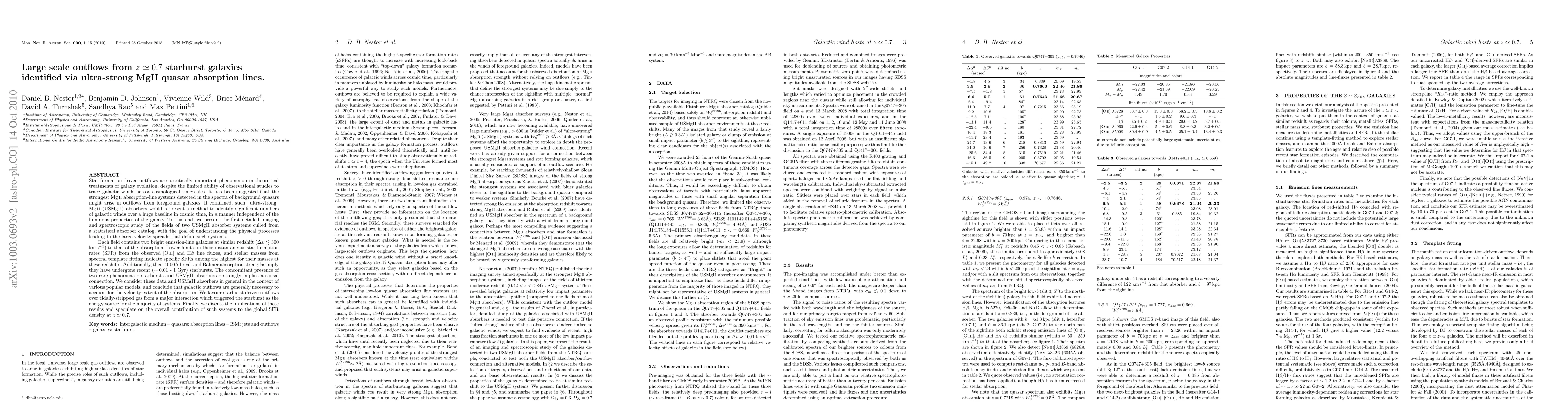 (Abridged) Star formation-driven outflows are a critical phenomenon in theoretical treatments of galaxy evolution, despite the limited ability of observations to trace them across cosmological timescales. If the strongest MgII absorption-line systems detected in the spectra of background quasars arise in such outflows, "ultra-strong" MgII (USMgII) absorbers would identify significant numbers of galactic winds over a huge baseline in cosmic time, in a manner independent of the luminous properties of the galaxy. To this end, we present the first detailed imaging and spectroscopic study of the fields of two USMgII absorber systems culled from a statistical absorber catalog, with the goal of understanding the physical processes leading to the large velocity spreads that define such systems. Each field contains two bright emission-line galaxies at similar redshift (dv < 300 km/s) to that of the absorption. Lower-limits on their instantaneous star formation rates (SFR) from the observed OII and Hb line fluxes, and stellar masses from spectral template fitting indicate specific SFRs among the highest for their masses at z~0.7. Additionally, their 4000A break and Balmer absorption strengths imply they have undergone recent (~0.01 - 1 Gyr) starbursts. The concomitant presence of two rare phenomena - starbursts and USMgII absorbers - strongly implies a causal connection. We consider these data and USMgII absorbers in general in the context of various popular models, and conclude that galactic outflows are generally necessary to account for the velocity extent of the absorption. We favour starburst driven outflows over tidally-stripped gas from a major interaction which triggered the starburst as the energy source for the majority of systems. Finally, we discuss the implications of these results and speculate on the overall contribution of such systems to the global SFR density at z~0.7.