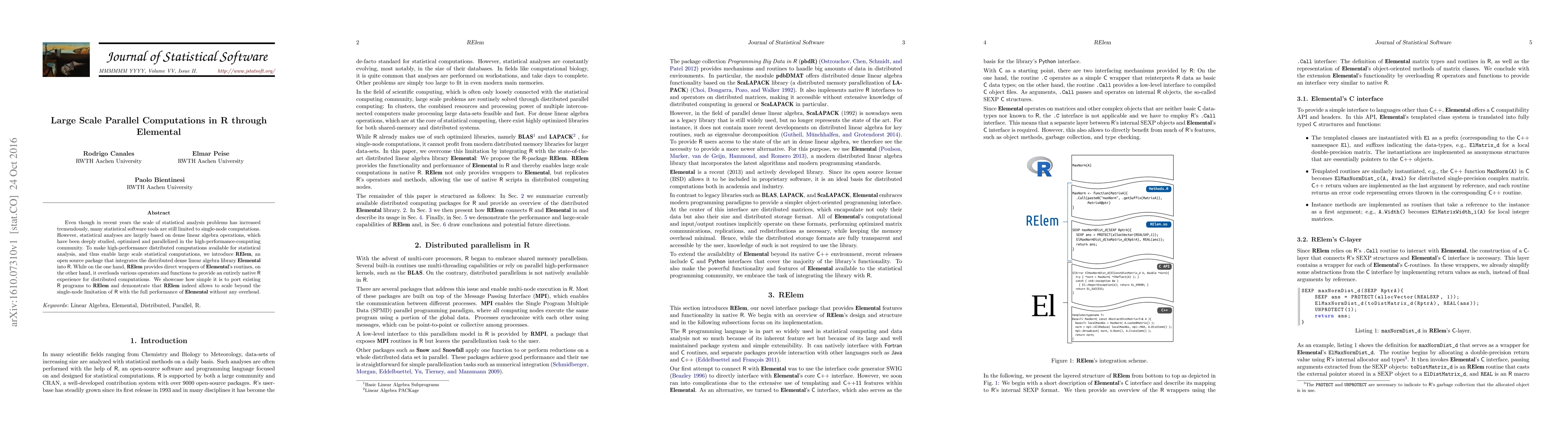 The paper introduces RElem, an open-source R package that integrates the distributed dense linear algebra library Elemental, enabling large-scale statistical computations by providing direct wrappers of Elemental's routines and overloading various operators and functions for a native R experience.