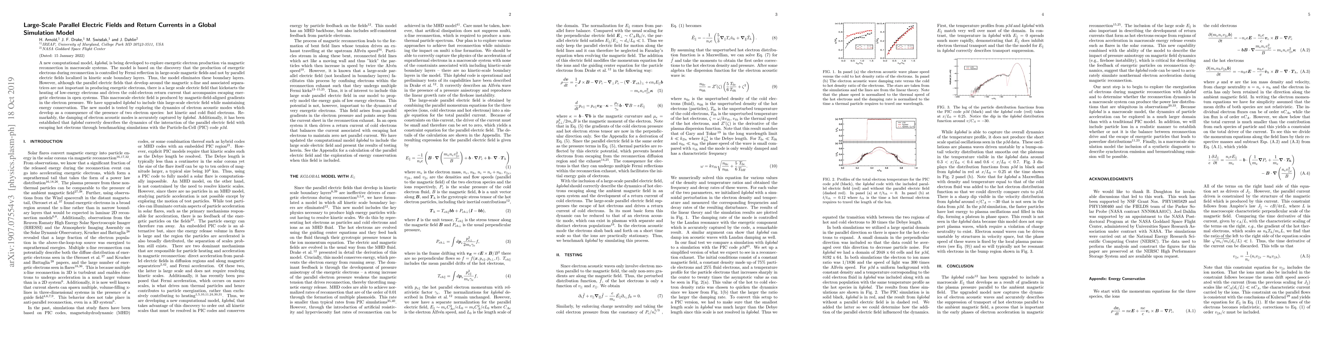 A new computational model, kglobal, is being developed to explore energetic electron production via magnetic reconnection in macroscale systems. The model is based on the discovery that the production of energetic electrons during reconnection is controlled by Fermi reflection in large-scale magnetic fields and not by parallel electric fields localized in kinetic scale boundary layers. Thus, the model eliminates these boundary layers. However, although the parallel electric fields that develop around the magnetic x-line and associated separatrices are not important in producing energetic electrons, there is a large scale electric field that kickstarts the heating of low-energy electrons and drives the cold-electron return current that accompanies escaping energetic electrons in open systems. This macroscale electric field is produced by magnetic-field-aligned gradients in the electron pressure. We have upgraded kglobal to include this large-scale electric field while maintaining energy conservation. The new model is tested by exploring the dynamics of electron acoustic modes which develop as a consequence of the presence of two electron species: hot kinetic and cold fluid electrons. Remarkably, the damping of electron acoustic modes is accurately captured by kglobal. Additionally, it has been established that kglobal correctly describes the dynamics of the interaction of the parallel electric field with escaping hot electrons through benchmarking simulations with the Particle-In-Cell (PIC) code p3d.