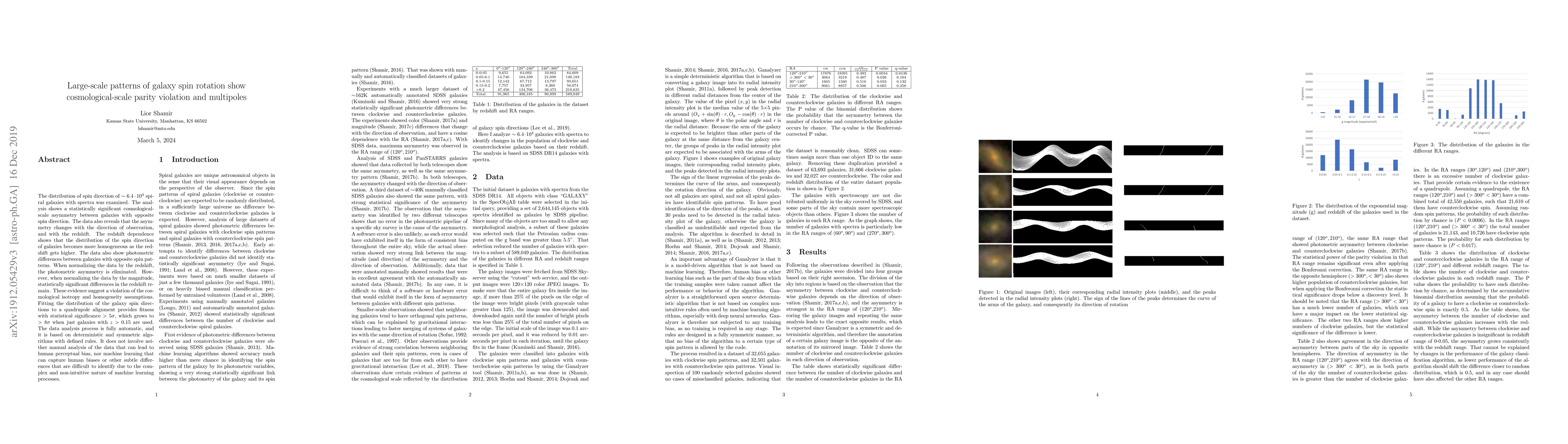 The distribution of spin direction of ~6.4*10^4 spiral galaxies with spectra was examined. The analysis shows a statistically significant cosmological-scale asymmetry between galaxies with opposite spin direction. The data also reveals that the asymmetry changes with the direction of observation, and with the redshift. The redshift dependence shows that the distribution of the spin direction of galaxies becomes more homogeneous as the redshift gets higher. The data also show photometric differences between galaxies with opposite spin patterns. When normalizing the data by the redshift, the photometric asymmetry is eliminated. However, when normalizing the data by the magnitude, statistically significant differences in the redshift remain. These evidence suggest a violation of the cosmological isotropy and homogeneity assumptions. Fitting the distribution of the galaxy spin directions to a quadrupole alignment provides fitness with statistical significance >5 sigma, which grows to >8 sigma when just galaxies with $z>0.15$ are used. The data analysis process is fully automatic, and it is based on deterministic and symmetric algorithms with defined rules. It does not involve neither manual analysis of the data that can lead to human perceptual bias, nor machine learning that can capture human biases or other subtle differences that are difficult to identify due to the complex and non-intuitive nature of machine learning processes.