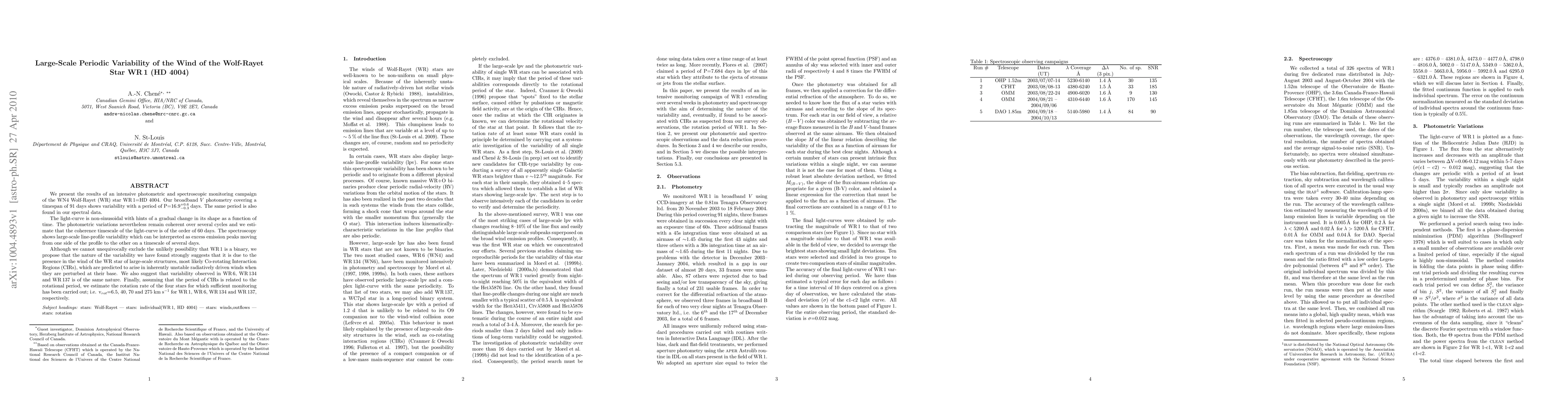 We present the results of an intensive photometric and spectroscopic monitoring campaign of the WN4 Wolf-Rayet (WR) star WR1=HD4004. Our broadband V photometry covering a timespan of 91 days shows variability with a period of P=16.9$^{+0.6}_{-0.3}$ days. The same period is also found in our spectral data. The light-curve is non-sinusoidal with hints of a gradual change in its shape as a function of time. The photometric variations nevertheless remain coherent over several cycles and we estimate that the coherence timescale of the light-curve is of the order of 60 days. The spectroscopy shows large-scale line-profile variability which can be interpreted as excess emission peaks moving from one side of the profile to the other on a timescale of several days. Although we cannot unequivocally exclude the unlikely possibility that WR1 is a binary, we propose that the nature of the variability we have found strongly suggests that it is due to the presence in the wind of the WR star of large-scale structures, most likely Co-rotating Interaction Regions (CIRs), which are predicted to arise in inherently unstable radiatively driven winds when they are perturbed at their base. We also suggest that variability observed in WR6, WR134 and WR137 is of the same nature. Finally, assuming that the period of CIRs is related to the rotational period, we estimate the rotation rate of the four stars for which sufficient monitoring has been carried out; i.e. v$_{rot}$=6.5, 40, 70 and 275 km/s for WR1, WR6, WR134 and WR137, respectively.