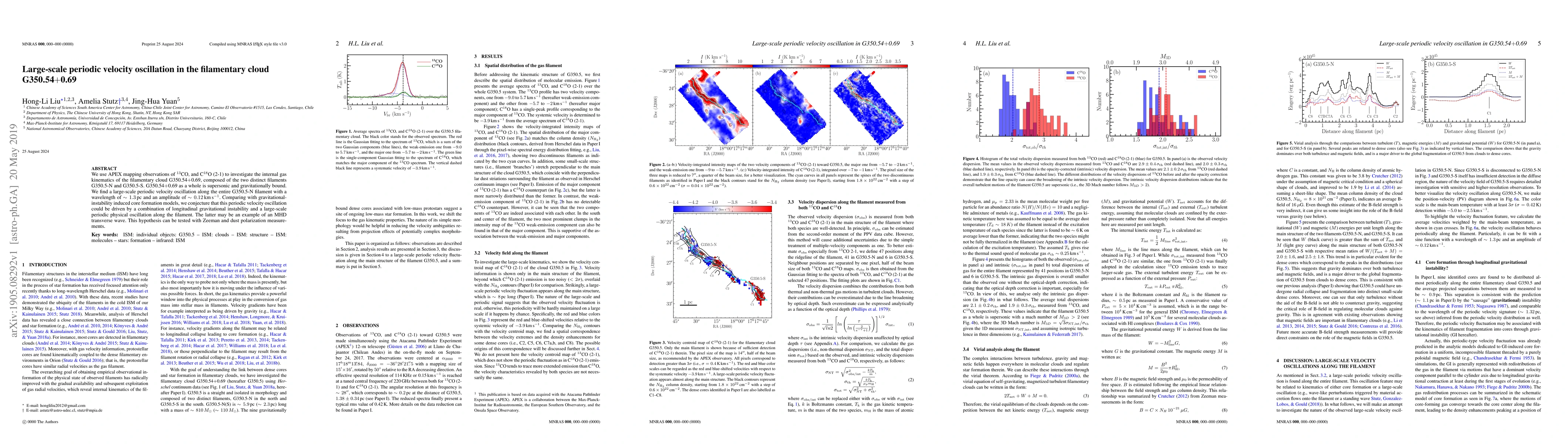 We use APEX mapping observations of 13CO, and C18O (2-1) to investigate the internal gas kinematics of the filamentary cloud G350.54+0.69, composed of the two distinct filaments G350.5-N and G350.5-S. G350.54+0.69 as a whole is supersonic and gravitationally bound. We find a large-scale periodic velocity oscillation along the entire G350.5-N filament with a wavelength of ~1.3 pc and an amplitude of ~0.12 km/s. Comparing with gravitational-instability induced core formation models, we conjecture that this periodic velocity oscillation could be driven by a combination of longitudinal gravitational instability and a large-scale periodic physical oscillation along the filament. The latter may be an example of an MHD transverse wave. This hypothesis can be tested with Zeeman and dust polarization measurements.