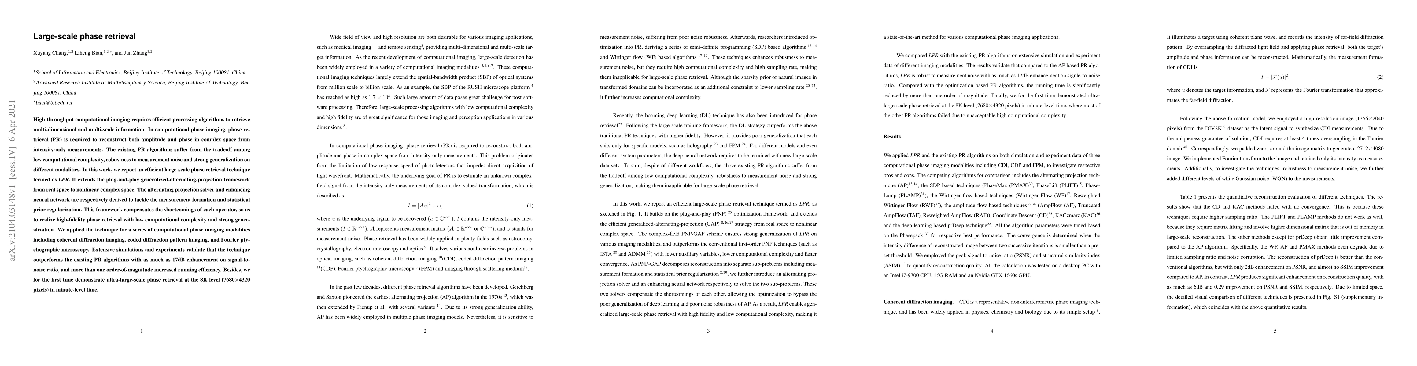 This paper introduces an efficient large-scale phase retrieval technique called LPR, which extends the plug-and-play framework to complex space for high-fidelity phase reconstruction. The method combines an alternating projection solver and an enhancing neural network, achieving significant improvements in computational efficiency and signal-to-noise ratio over existing algorithms.