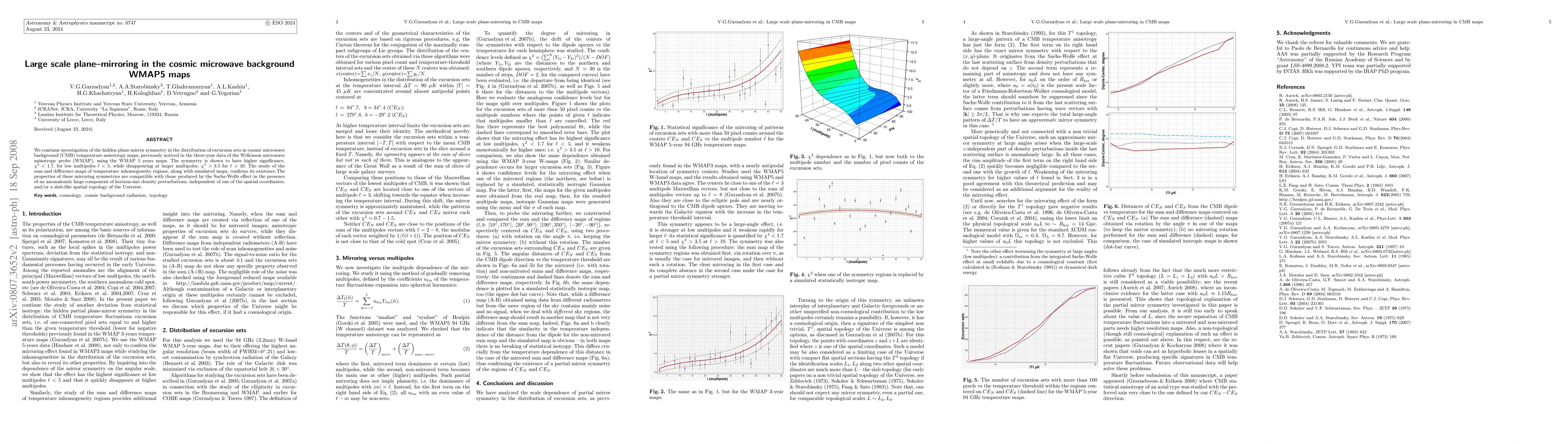 We continue investigation of the hidden plane-mirror symmetry in the distribution of excursion sets in cosmic microwave background (CMB) temperature anisotropy maps, previously noticed in the three-year data of the Wilkinson microwave anisotropy probe (WMAP), using the WMAP 5 years maps. The symmetry is shown to have higher significance, \chi^2 < 1.7, for low multipoles \ell < 5, while disappearing at larger multipoles, \chi^2 > 3.5 for \ell > 10. The study of the sum and difference maps of temperature inhomogeneity regions, along with simulated maps, confirms its existence.The properties of these mirroring symmetries are compatible with those produced by the Sachs-Wolfe effect in the presence of an anomalously large component of horizon-size density perturbations, independent of one of the spatial coordinates, and/or a slab-like spatial topology of the Universe.