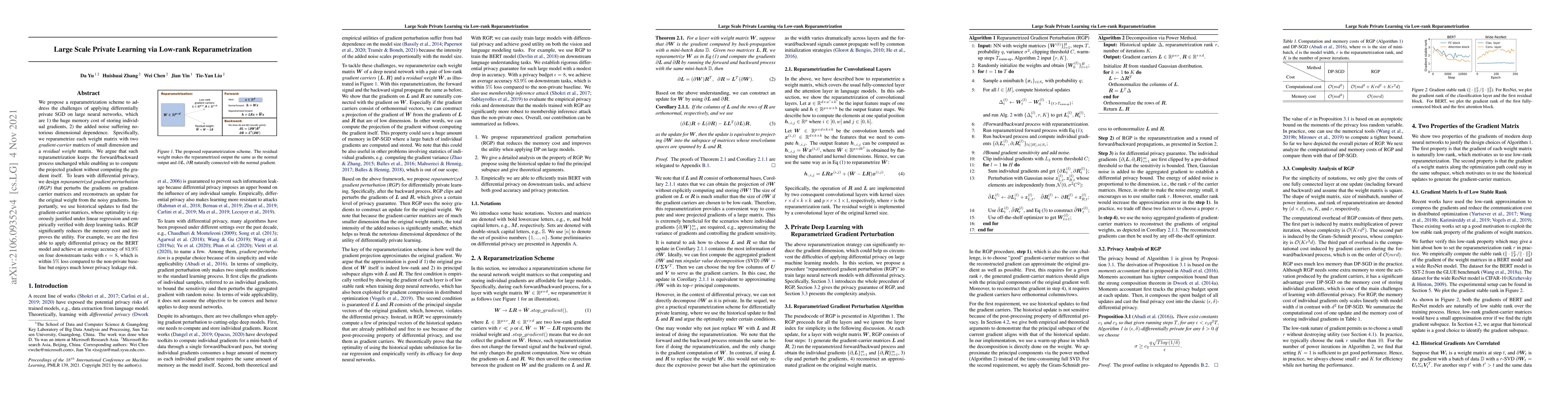 We propose a reparametrization scheme to address the challenges of applying differentially private SGD on large neural networks, which are 1) the huge memory cost of storing individual gradients, 2) the added noise suffering notorious dimensional dependence. Specifically, we reparametrize each weight matrix with two \emph{gradient-carrier} matrices of small dimension and a \emph{residual weight} matrix. We argue that such reparametrization keeps the forward/backward process unchanged while enabling us to compute the projected gradient without computing the gradient itself. To learn with differential privacy, we design \emph{reparametrized gradient perturbation (RGP)} that perturbs the gradients on gradient-carrier matrices and reconstructs an update for the original weight from the noisy gradients. Importantly, we use historical updates to find the gradient-carrier matrices, whose optimality is rigorously justified under linear regression and empirically verified with deep learning tasks. RGP significantly reduces the memory cost and improves the utility. For example, we are the first able to apply differential privacy on the BERT model and achieve an average accuracy of $83.9\%$ on four downstream tasks with $\epsilon=8$, which is within $5\%$ loss compared to the non-private baseline but enjoys much lower privacy leakage risk.