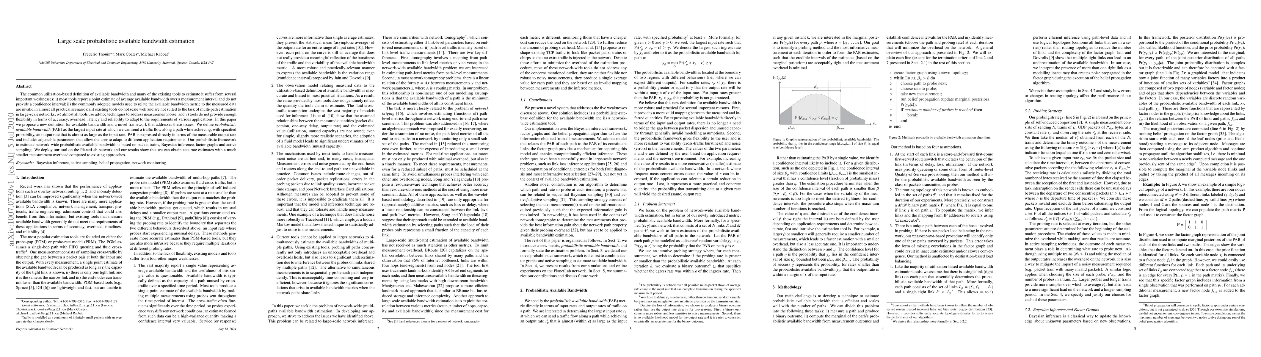 This paper proposes a new probabilistic definition of available bandwidth and a framework to estimate it accurately in large-scale networks, addressing weaknesses in existing tools by providing confidence intervals, scaling to multi-path estimation, and offering flexibility in accuracy and overhead. The proposed framework uses packet trains, Bayesian inference, and active sampling, demonstrating improved accuracy with lower measurement overhead.
