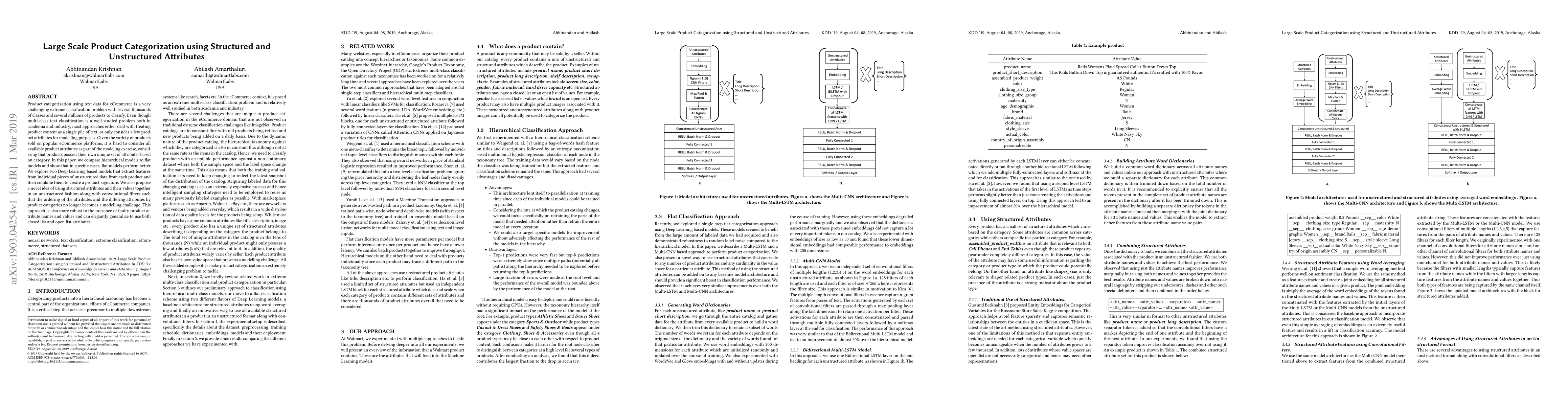 Product categorization using text data for eCommerce is a very challenging extreme classification problem with several thousands of classes and several millions of products to classify. Even though multi-class text classification is a well studied problem both in academia and industry, most approaches either deal with treating product content as a single pile of text, or only consider a few product attributes for modelling purposes. Given the variety of products sold on popular eCommerce platforms, it is hard to consider all available product attributes as part of the modeling exercise, considering that products possess their own unique set of attributes based on category. In this paper, we compare hierarchical models to flat models and show that in specific cases, flat models perform better. We explore two Deep Learning based models that extract features from individual pieces of unstructured data from each product and then combine them to create a product signature. We also propose a novel idea of using structured attributes and their values together in an unstructured fashion along with convolutional filters such that the ordering of the attributes and the differing attributes by product categories no longer becomes a modelling challenge. This approach is also more robust to the presence of faulty product attribute names and values and can elegantly generalize to use both closed list and open list attributes.
