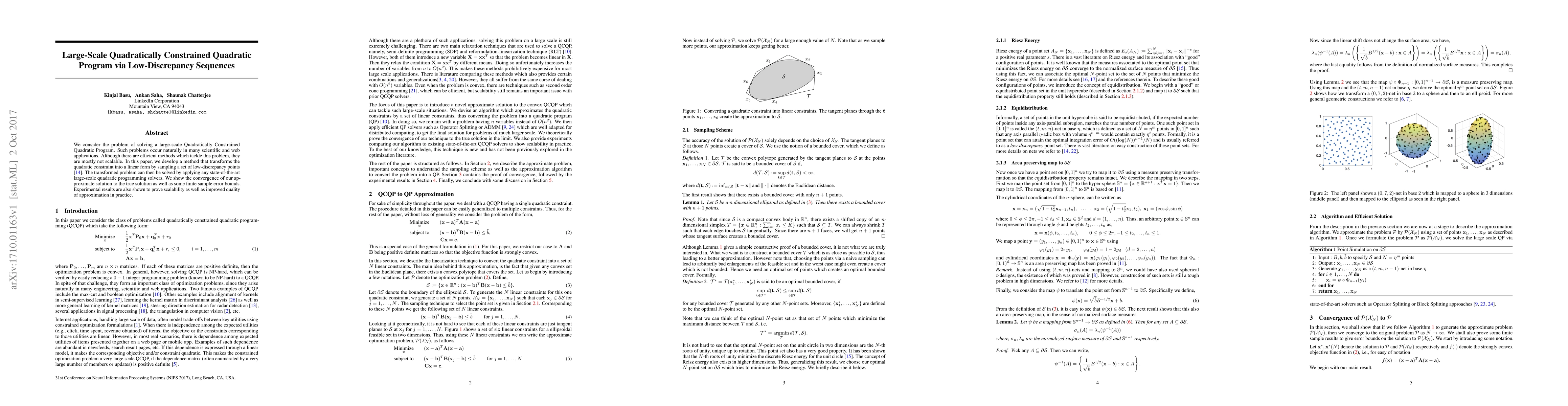 We consider the problem of solving a large-scale Quadratically Constrained Quadratic Program. Such problems occur naturally in many scientific and web applications. Although there are efficient methods which tackle this problem, they are mostly not scalable. In this paper, we develop a method that transforms the quadratic constraint into a linear form by sampling a set of low-discrepancy points. The transformed problem can then be solved by applying any state-of-the-art large-scale quadratic programming solvers. We show the convergence of our approximate solution to the true solution as well as some finite sample error bounds. Experimental results are also shown to prove scalability as well as improved quality of approximation in practice.