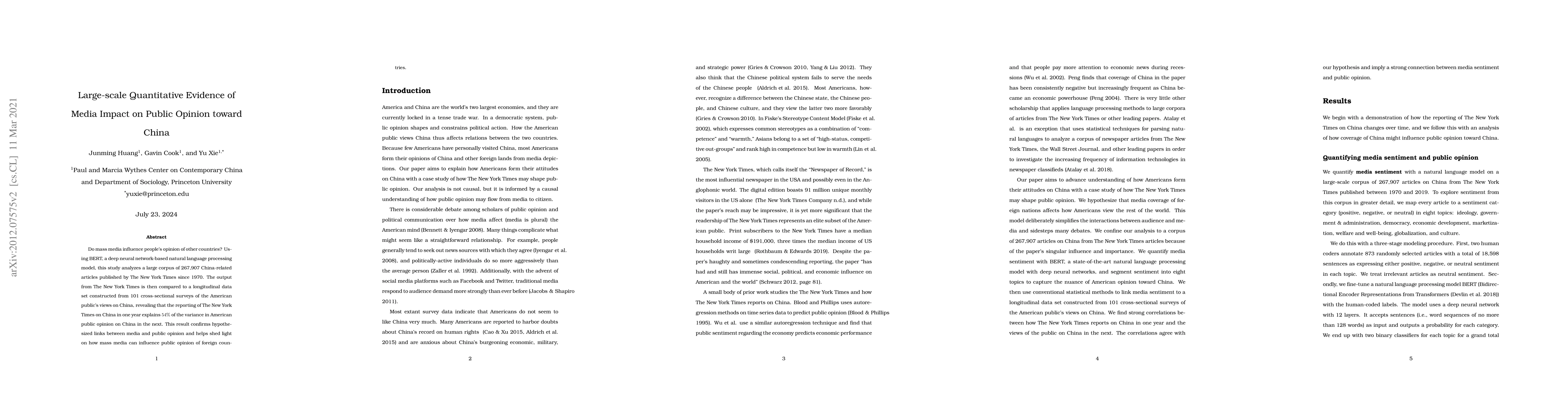 This study uses BERT to analyze 267,907 China-related articles from The New York Times and finds a strong correlation with shifts in American public opinion on China, explaining 54% of the variance in the following year. This confirms the significant impact of mass media on shaping public opinion about foreign countries.