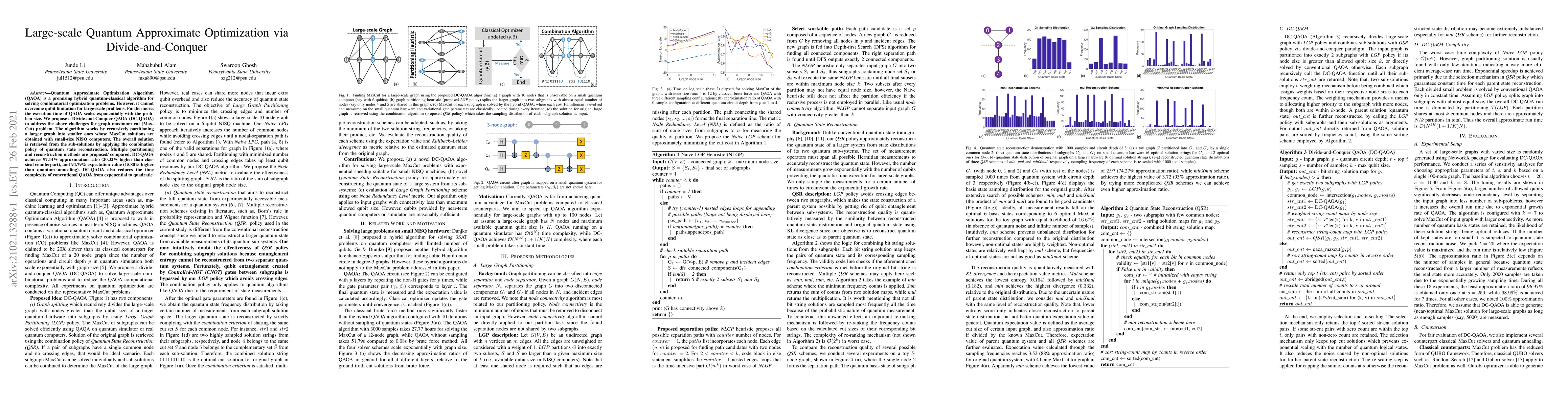 This paper proposes a Divide-and-Conquer Quantum Approximate Optimization Algorithm (DC-QAOA) to tackle large-scale combinatorial optimization problems, specifically the MaxCut problem, by partitioning large graphs into smaller ones and combining their solutions. DC-QAOA achieves a higher approximation ratio and lower time complexity compared to classical and quantum annealing methods.