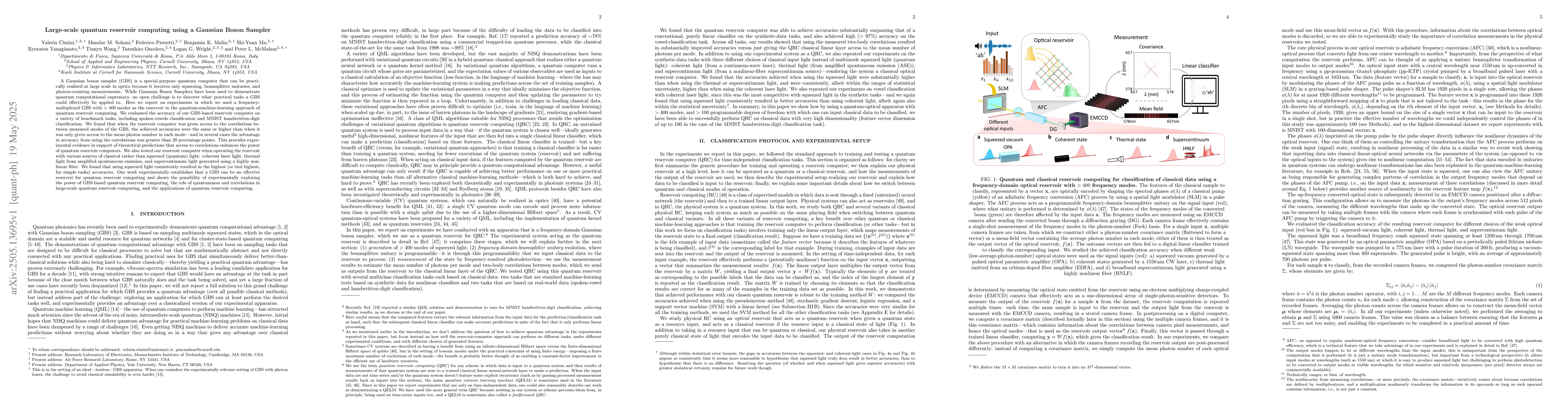 The paper presents a large-scale implementation of quantum reservoir computing using a Gaussian Boson Sampler, demonstrating the utility of quantum correlations in machine learning tasks.