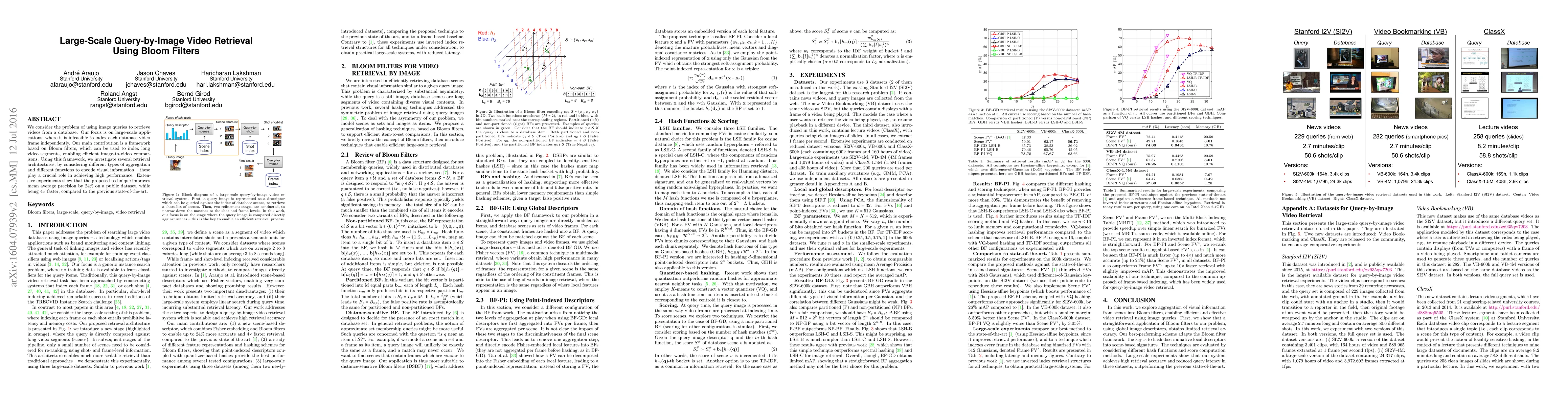 This paper proposes a Bloom filter-based framework for large-scale query-by-image video retrieval, enabling efficient indexing of long video segments and improving mean average precision by 24% while being four times faster than previous methods. The framework explores various retrieval architectures and encoding functions for visual information.